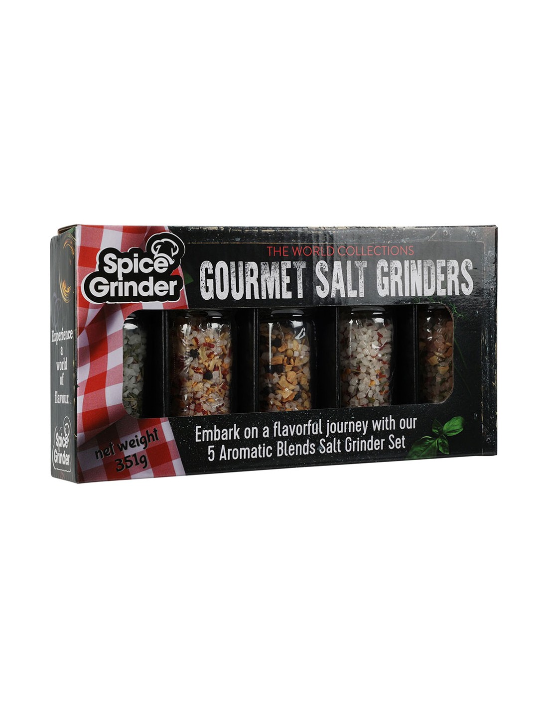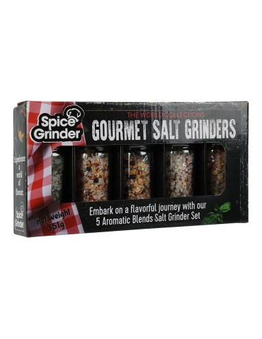 Molinillos de sal con 5 mezclas aromáticas. contiene: molinillo de sal para barabacoa 65 g, molinillo de sal mediterráneo 68 g, molinillo de sal peri perl 70 g, molinillo de sal de mezcla italiana 78 g y molinillo de sal y chile 70 g