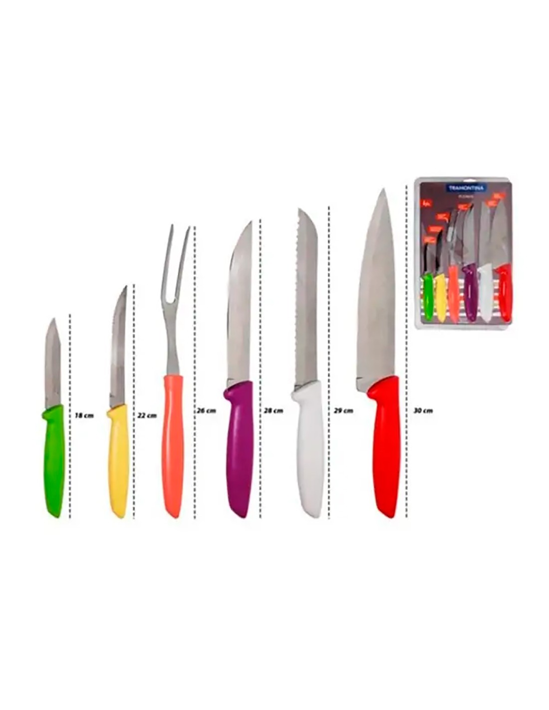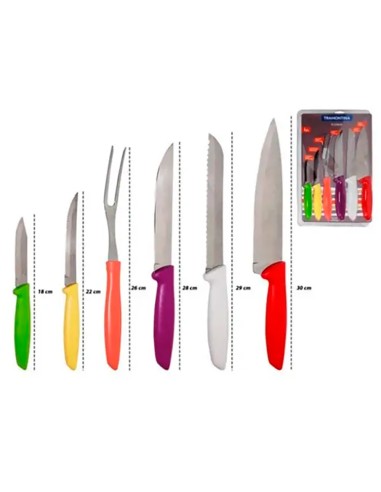 Juego de cuchillos de 6 piezas. contine: cuchillo fruta 8,2 cm / cuchillo asado 11,6 cm / cuchillo chef 17,7 cm / cuchillo pan 16,5 cm / cuchillo cocina 15,8 cm y tenedor trinchante 13 cm. material: acero inoxidable con acabado espejo y mango de polipropileno. colores surtidos