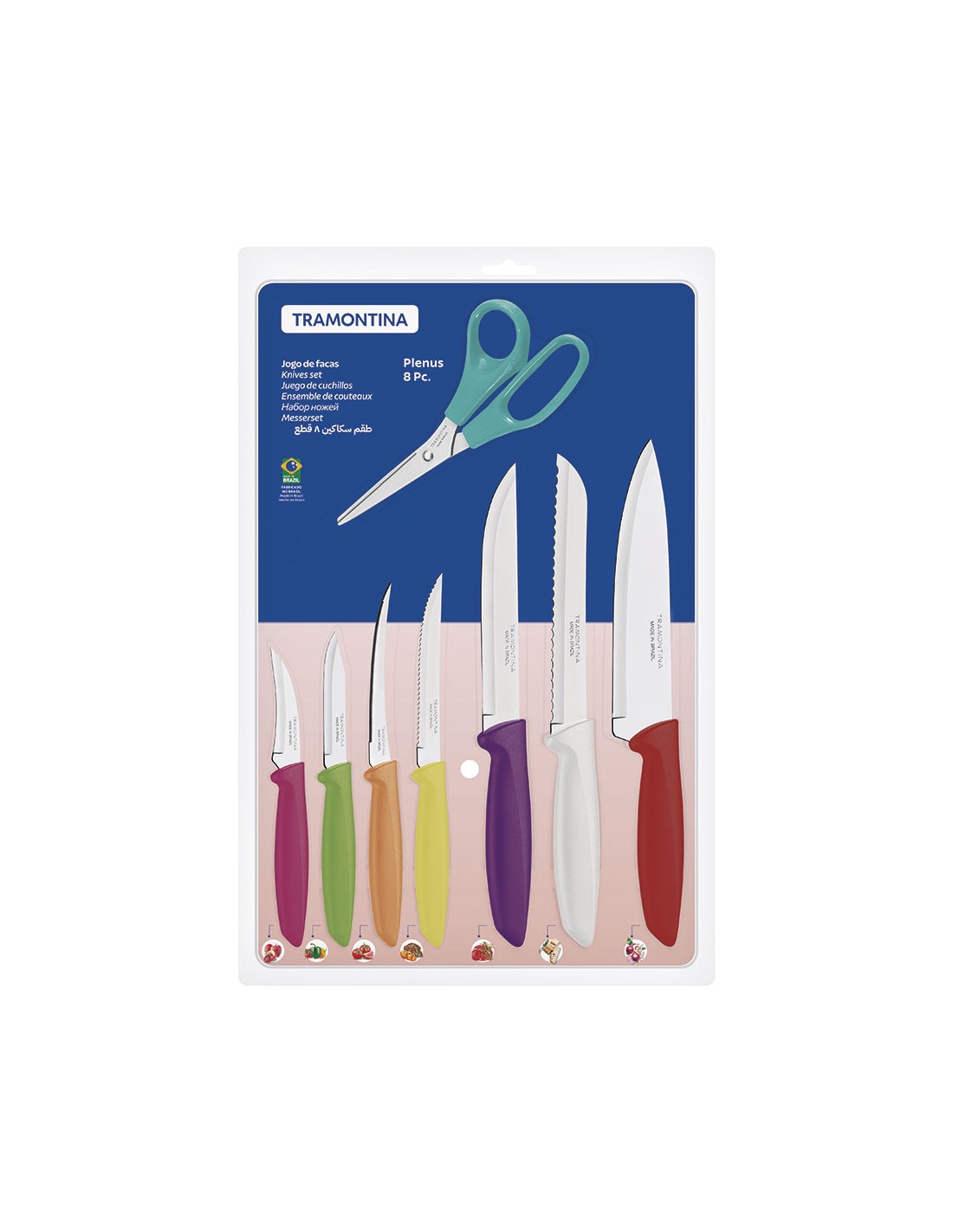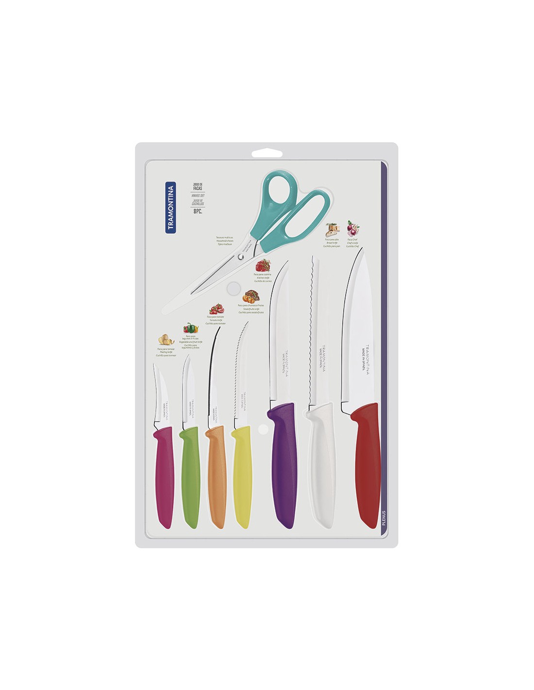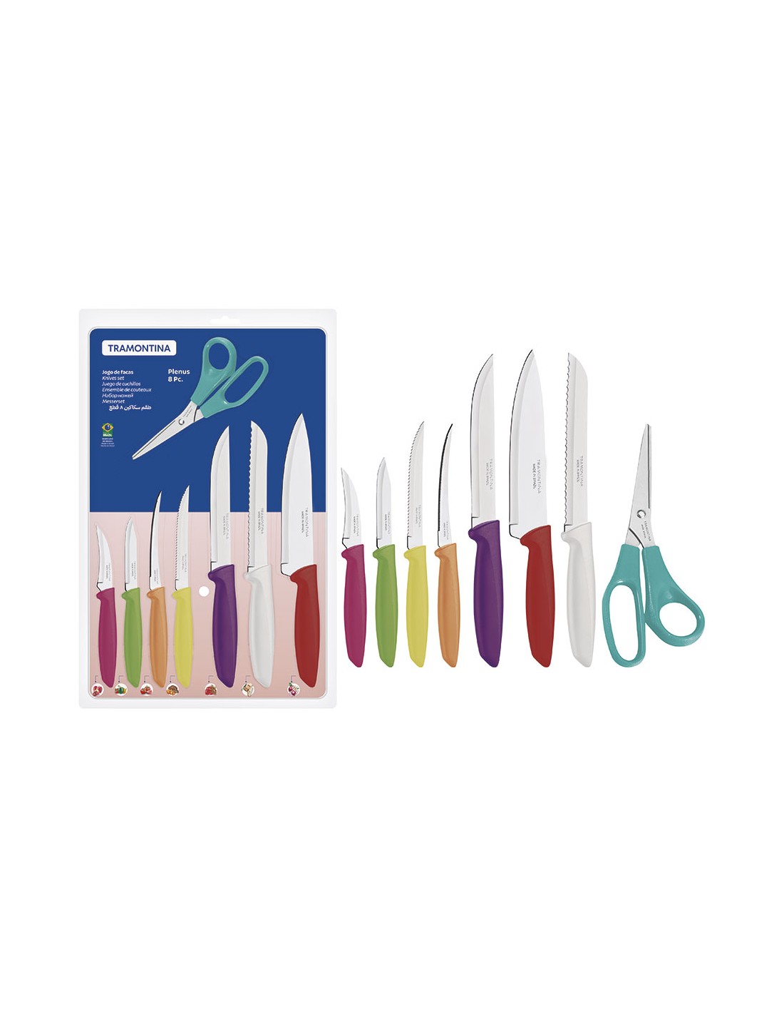 Juego de cuchillos de 8 piezas. contine: cuchillo fruta 8,2 cm / cuchillo asado y frutas 11,6 cm / cuchillo para tornear 7,3 cm / cuchillo chef 17 cm / cuchillo pan 16,5 cm / cuchillo cocina 15,8 cm / cuchillo para tomates 10,1 cm y tijera 12,1 cm. material: acero inoxidable con acabado espejo y mango de polipropileno. colores surtidos