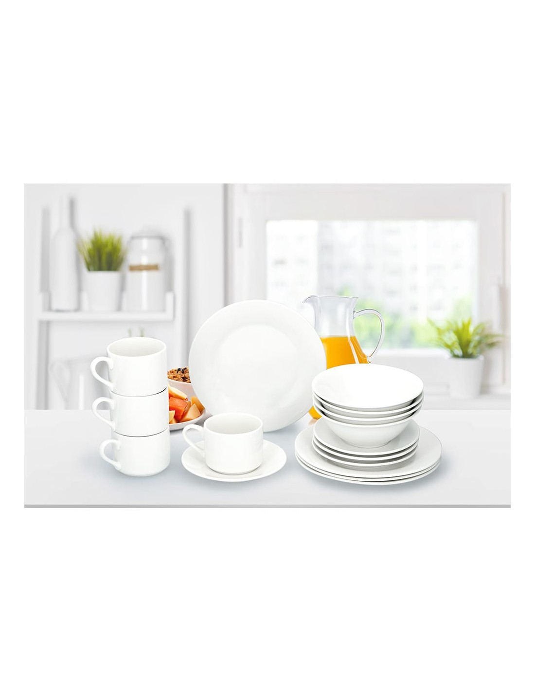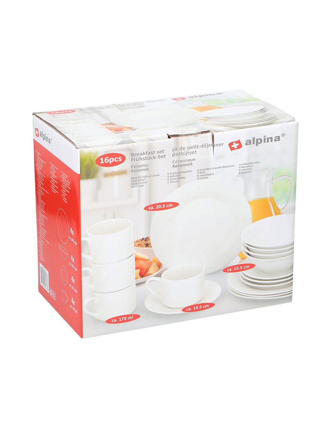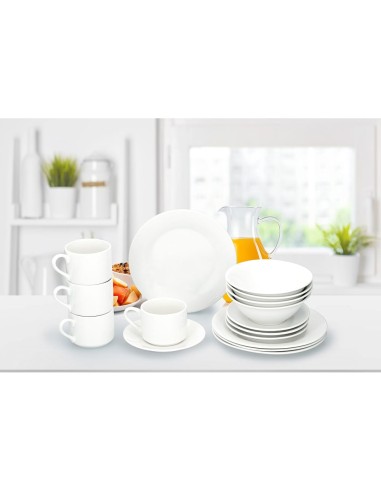 Vajilla desayuno blanca cerámica 16 piezas, contiene 4 platos de desayuno de ø20,5 cm, 4 platos de ø14,5 cm, 4 bols de ø15,5 cm y 4 tazas de 170 ml, apto para lavavajillas y microondas