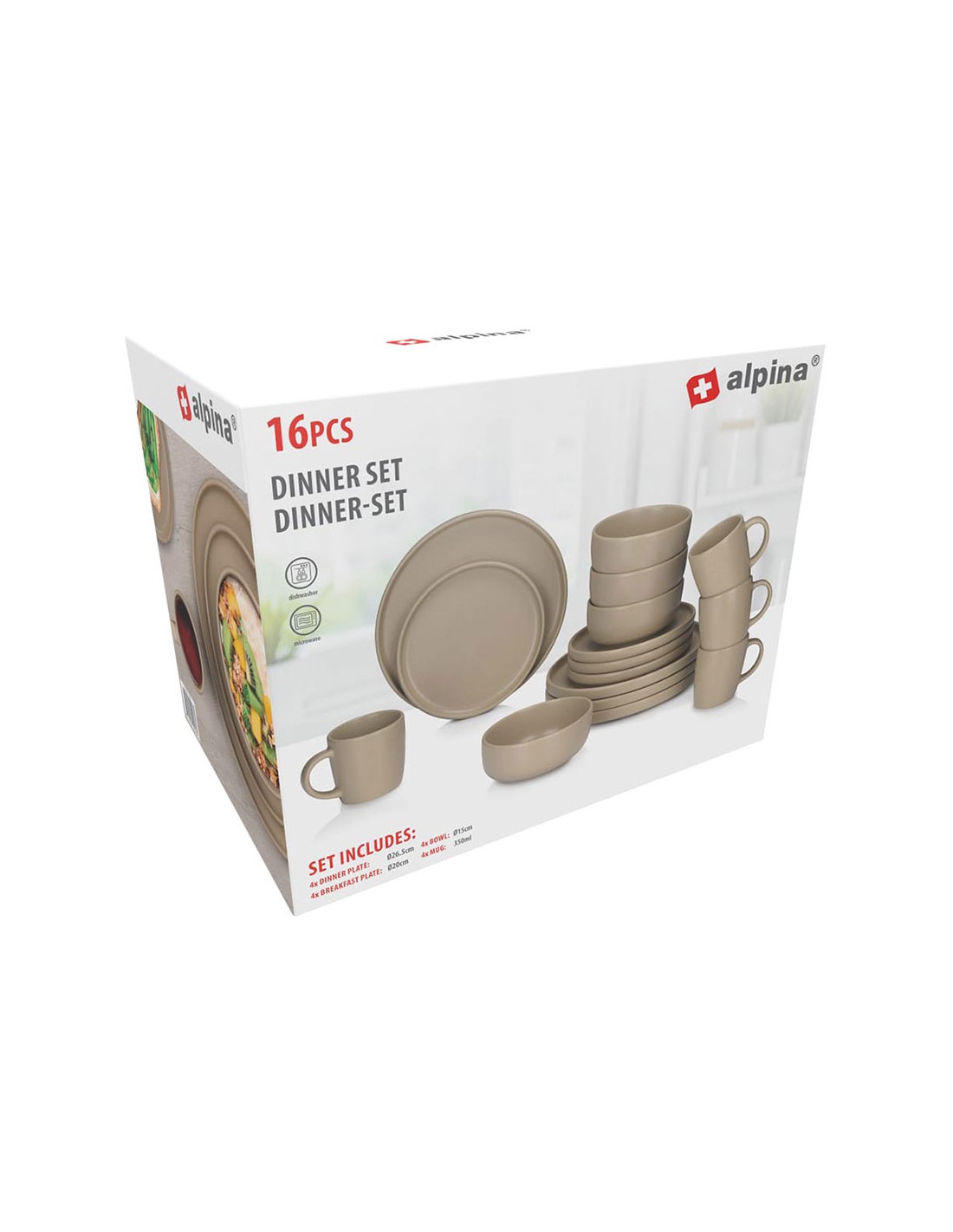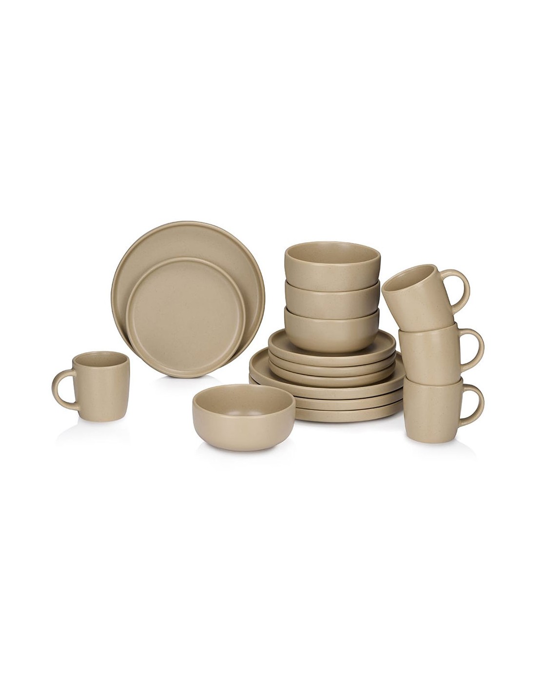 Vajilla taupe cerámica 16 piezas, contiene 4 platos de ø26,5 cm, 4 platos de postre de ø20 cm, 4 bols de ø15 cm y 4 tazas de 350 ml, apto para lavavajillas y microondas