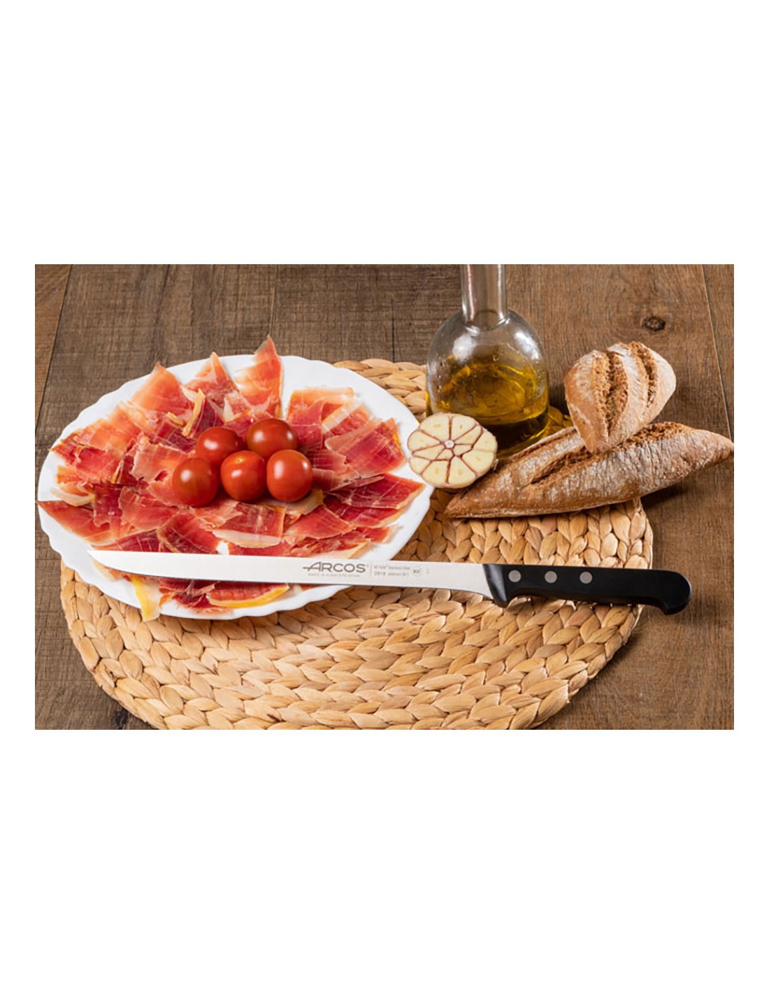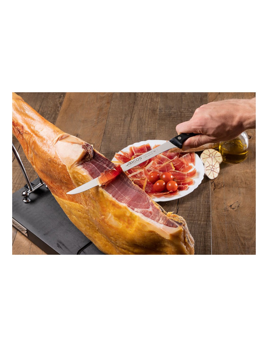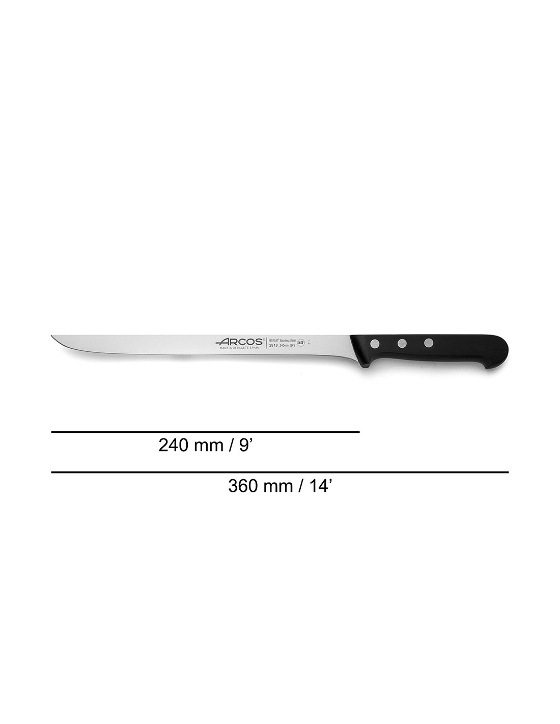 Cuchillo jamonero flexible serie universal 240 mm. fabricado con acero inoxidable nitrum®. mango de polioximetileno en color negro y sus clásicas líneas, tratado con el sistema bactiproof silver que consigue protegerlo de la aparición de manchas, olores y de microorganismos perjudiciales para la salud. remaches de acero inoxidable