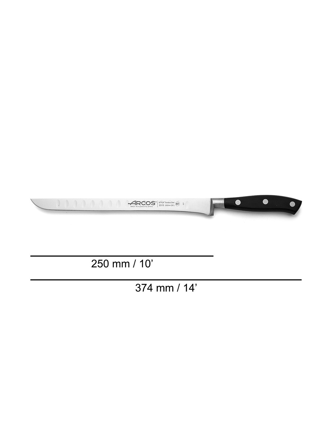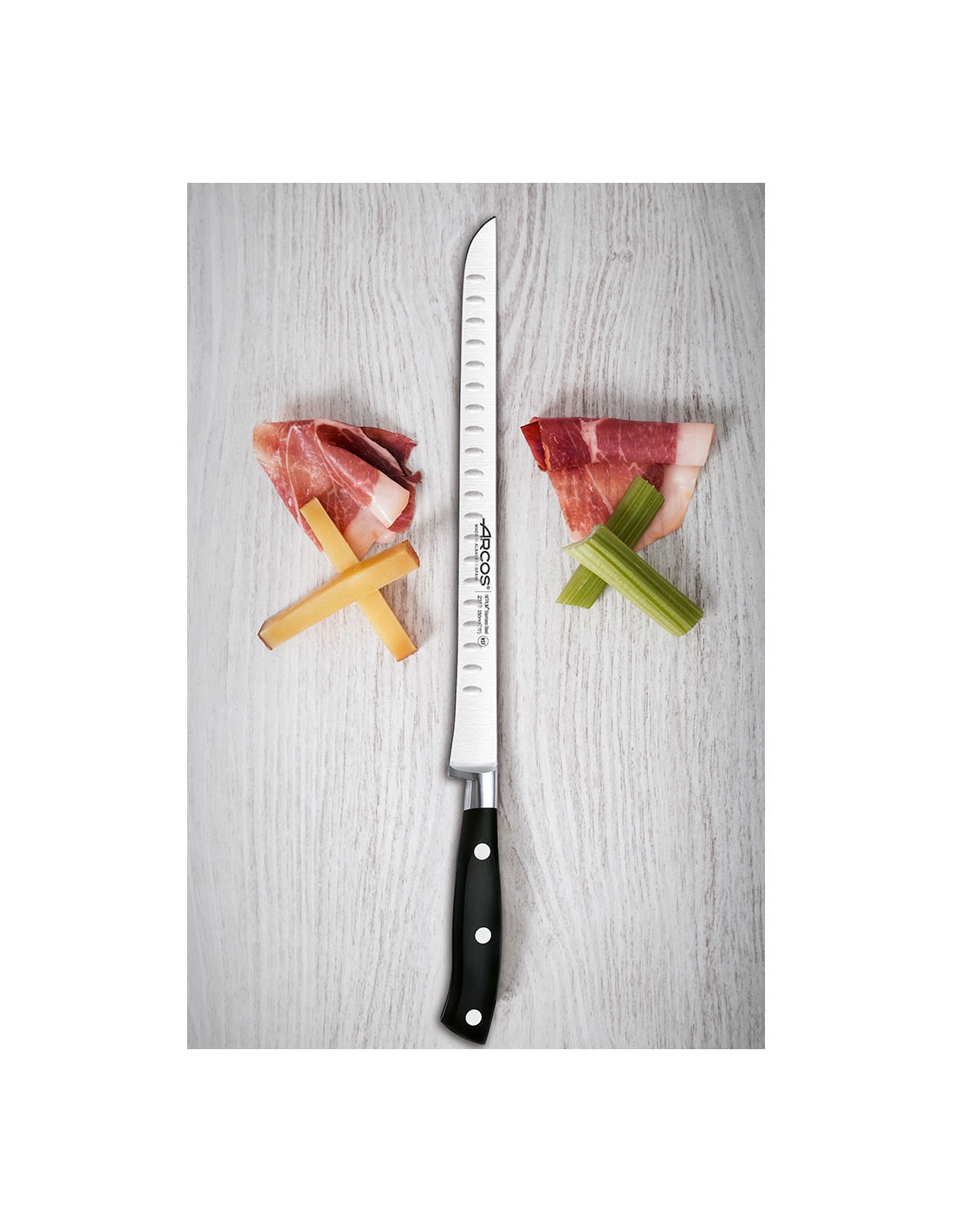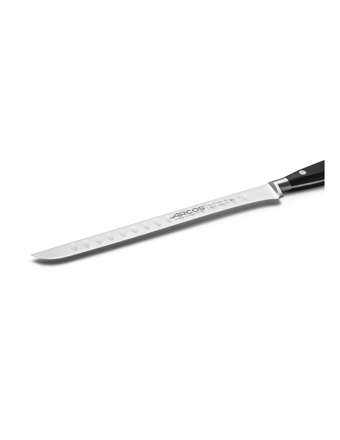 Cuchillo jamonero flexible serie riviera 250 mm. hoja forjada de acero inoxidable nitrum® .presenta alveolos para facilitar el corte. mango de polioximetileno. tiene una defensa al final del filo. incluye la tecnología bactiproof silver que actúa como escudo contra los gérmenes y las bacterias de la superficie del mango. sus remaches son de acero inoxidable