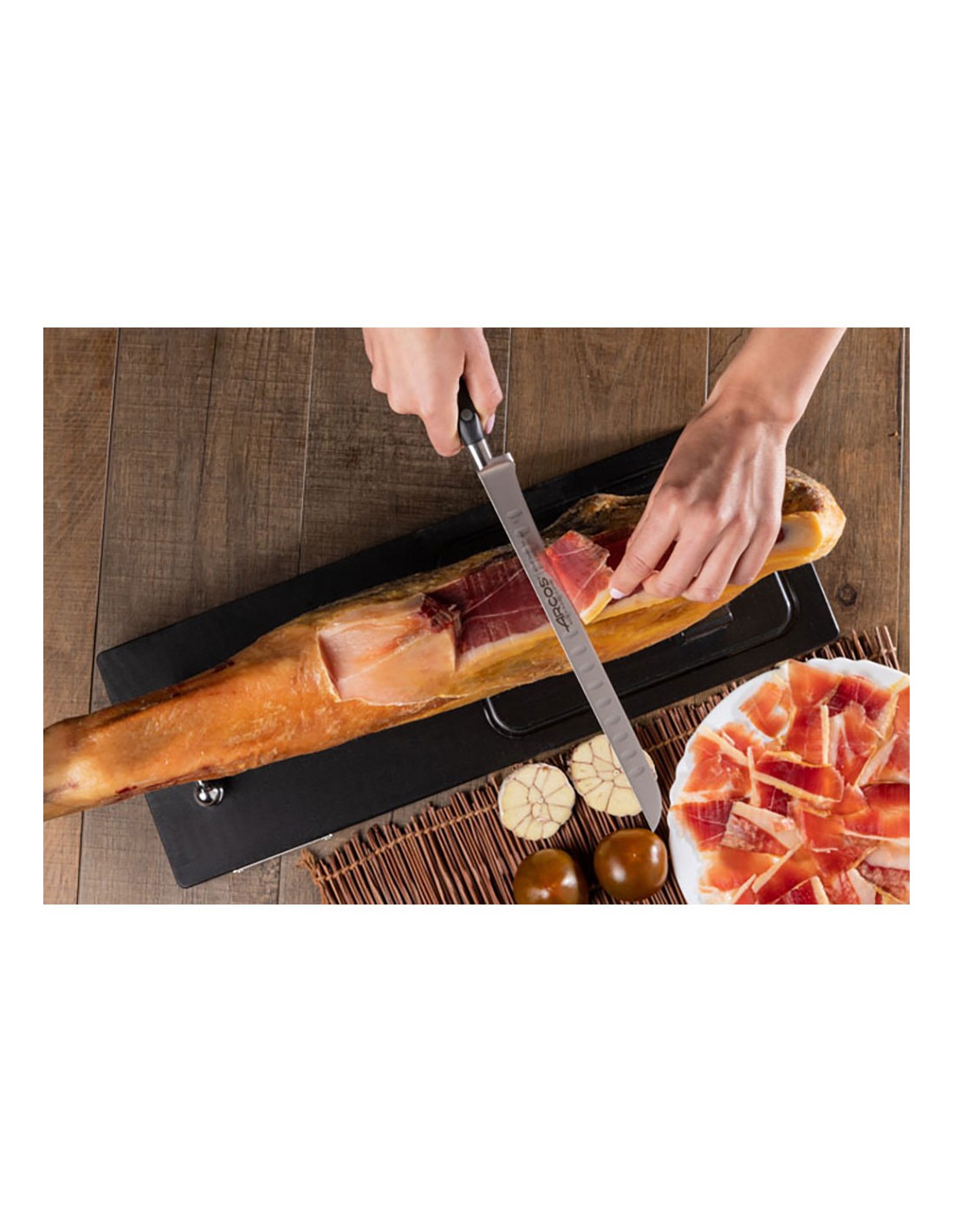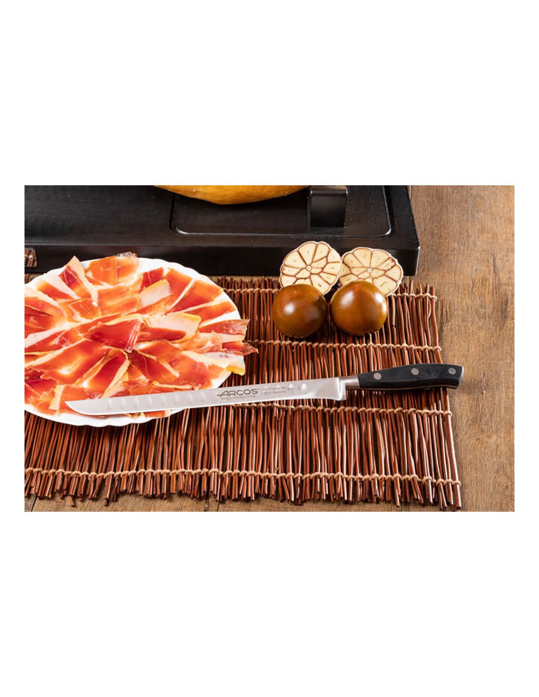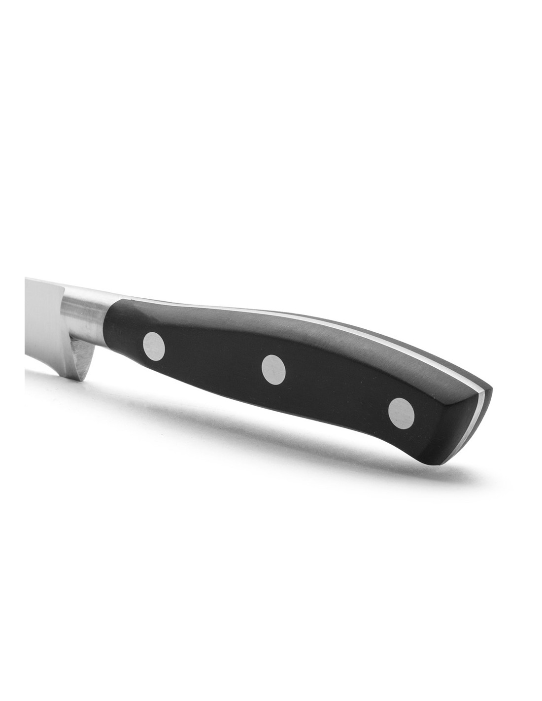 Cuchillo jamonero flexible serie riviera 250 mm. hoja forjada de acero inoxidable nitrum® .presenta alveolos para facilitar el corte. mango de polioximetileno. tiene una defensa al final del filo. incluye la tecnología bactiproof silver que actúa como escudo contra los gérmenes y las bacterias de la superficie del mango. sus remaches son de acero inoxidable