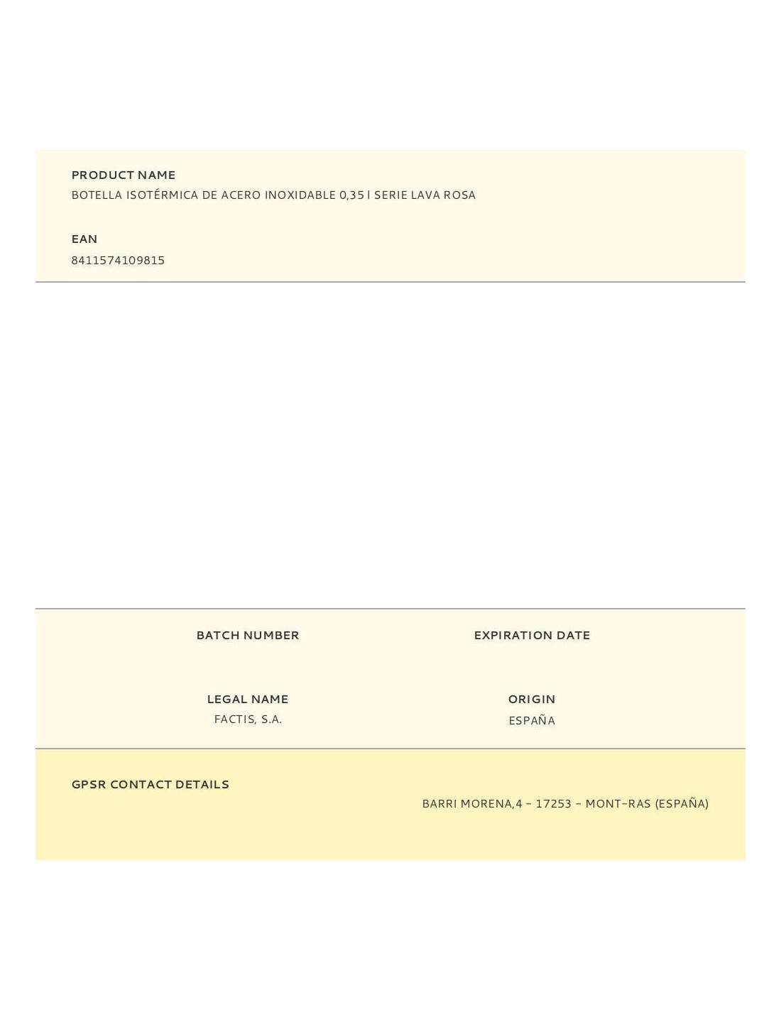 Botella isotérmica con doble pared de acero inoxidable. serie lava, color rosa. capacidad: 354 ml. aislamiento al vacío. mantiene la temperatura del líquido contenido (hasta 12 h bebidas calientes y 24 h bebidas frías). tapón de rosca hermético, con junta de polipropileno. base de silicona antideslizante