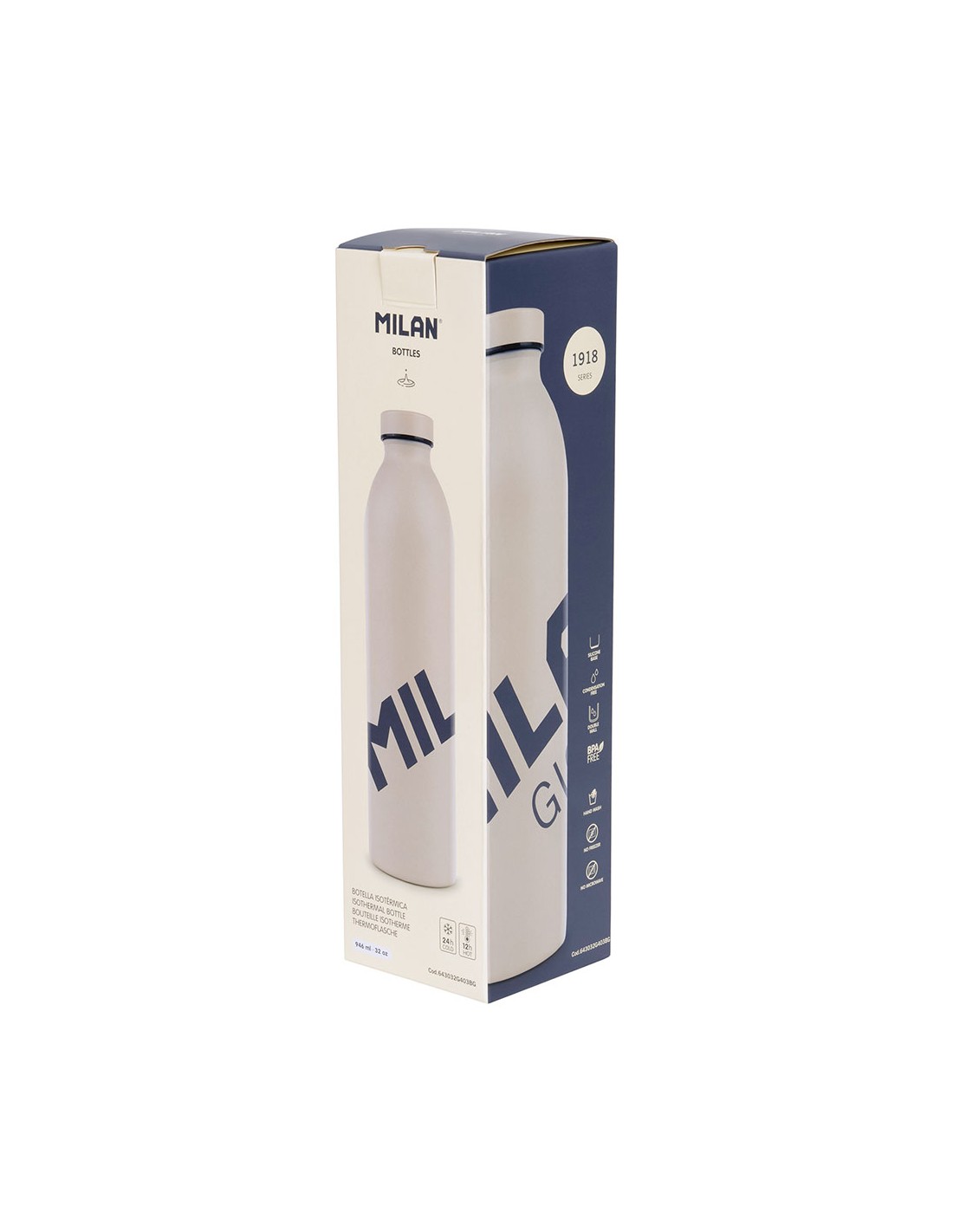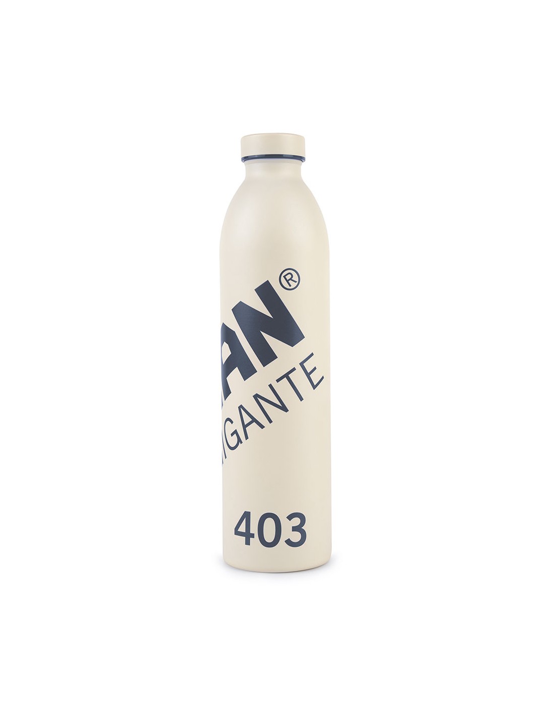 Botella con doble pared de acero inoxidable y aislamiento al vacío. conserva la temperatura de las bebidas calientes hasta 12 h y las bebidas frías hasta 24 h. con tapón de rosca hermético y junta de polipropileno. base de silicona antideslizante. capacidad: 0,946 l. medidas: ø8 x 30,7 cm. color beige y logotipo en azul marino