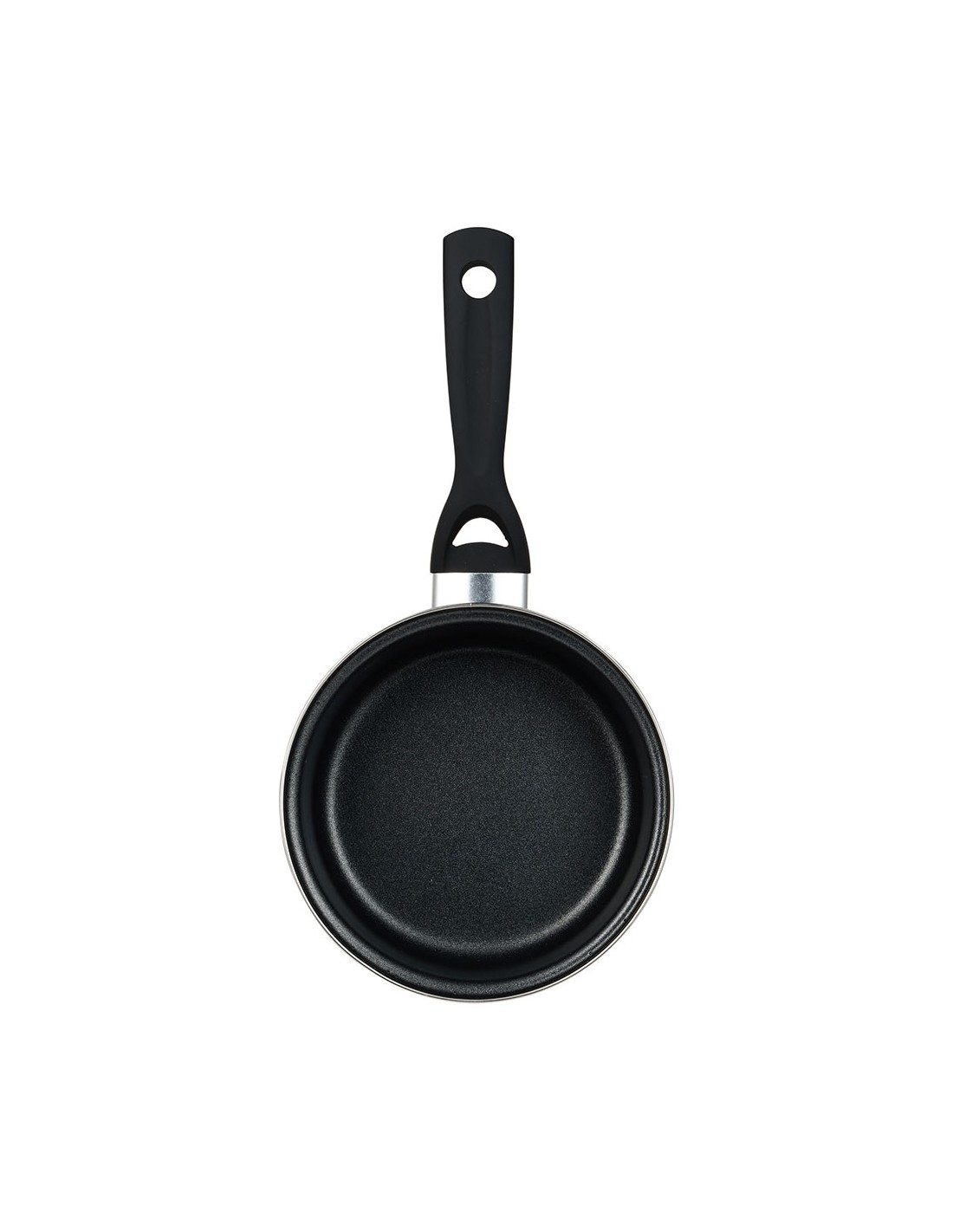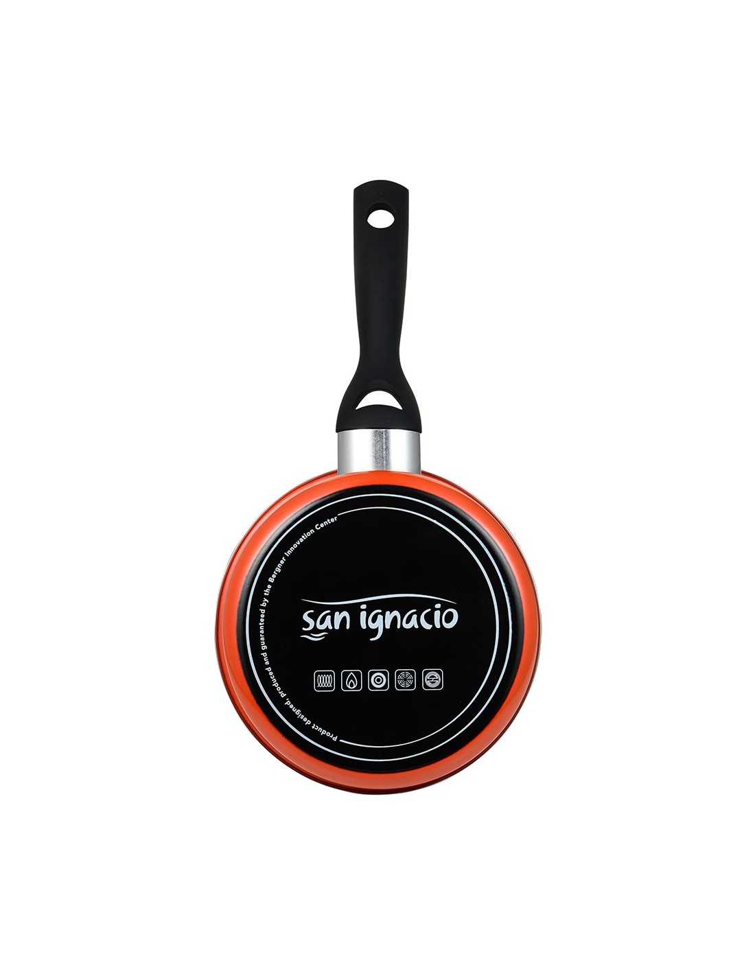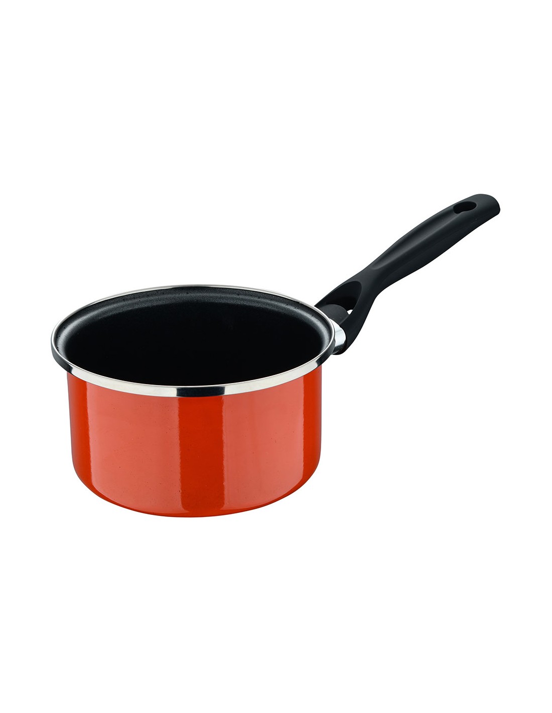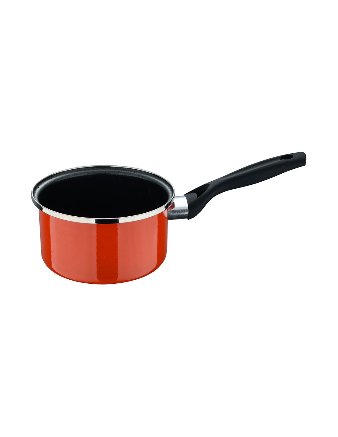 Cazo de acero al carbono para inducción, interior con recubrimiento antiadherente negro, exterior esmaltado de color naranja, mango negro suave al tacto resistente al calor, ø16 cm