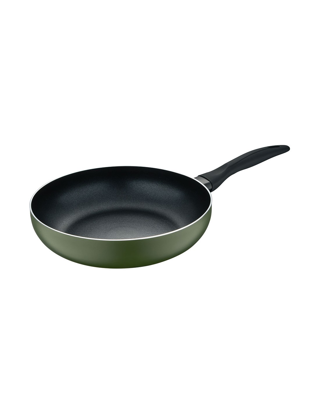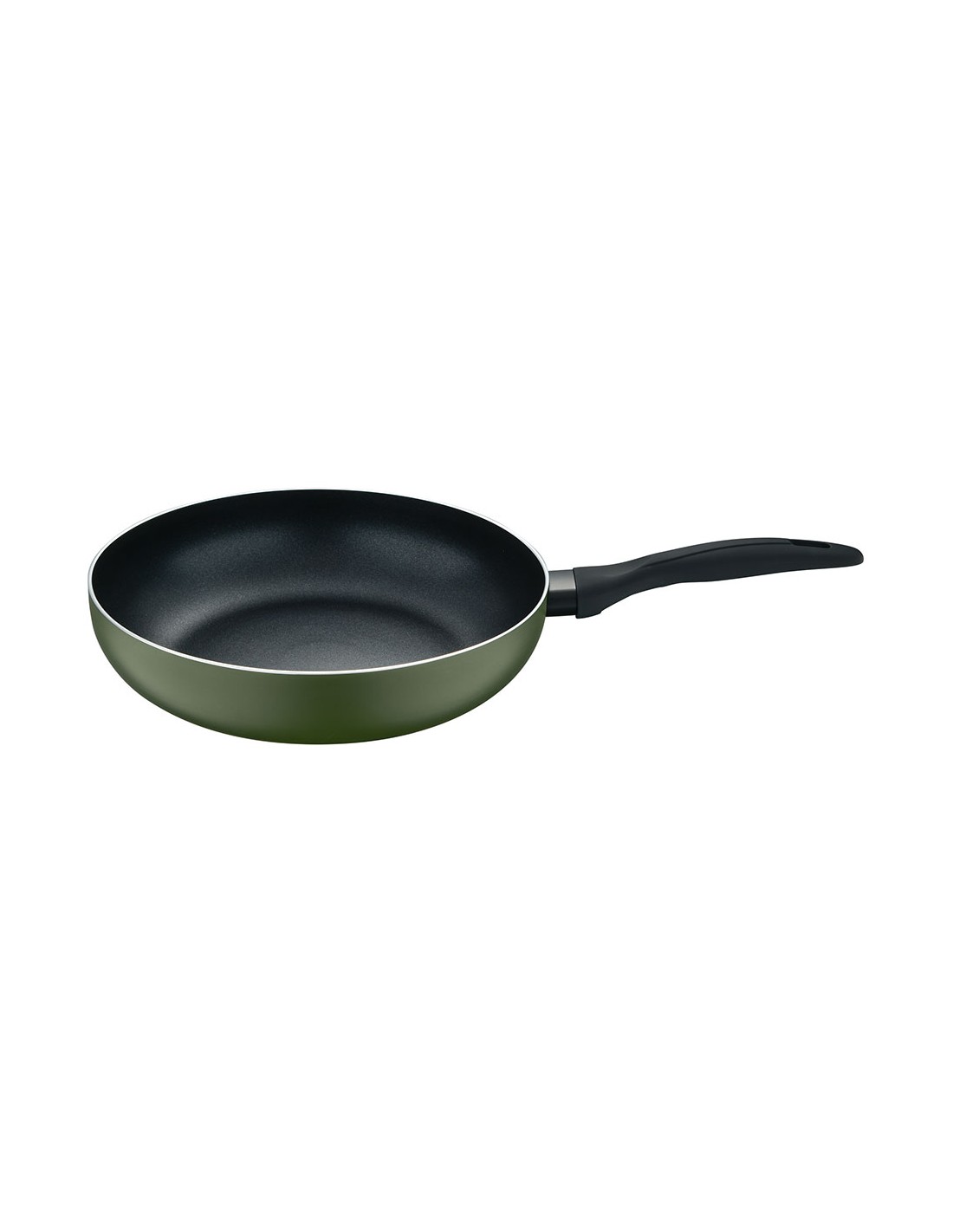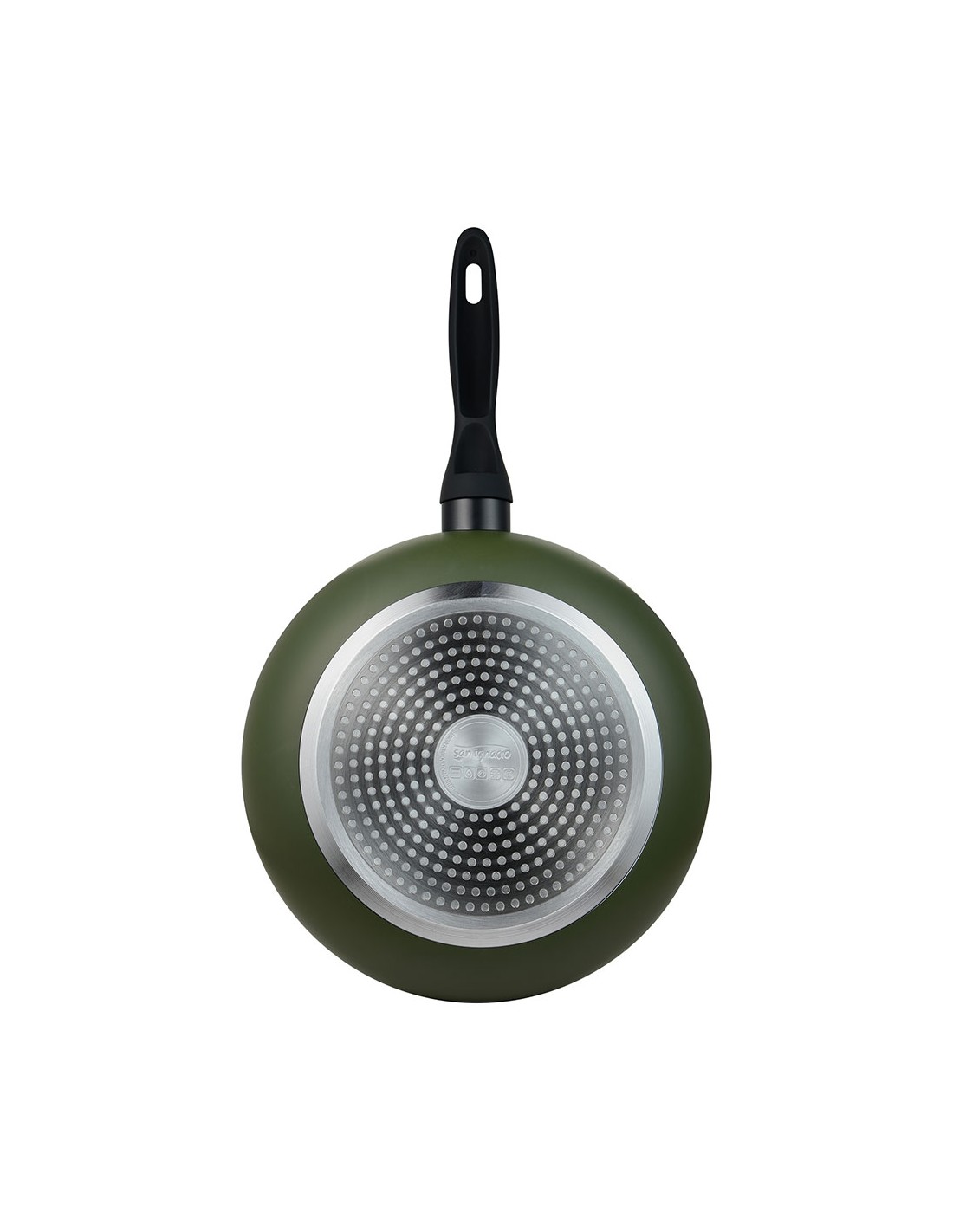 Sartén de aluminio prensado para inducción, acabado exterior verde, interior con revestimiento antiadherente negro, exterior resistente al calor en pq-7764c. mango negro resistente al calor con tacto suave, ø26 x 6 cm