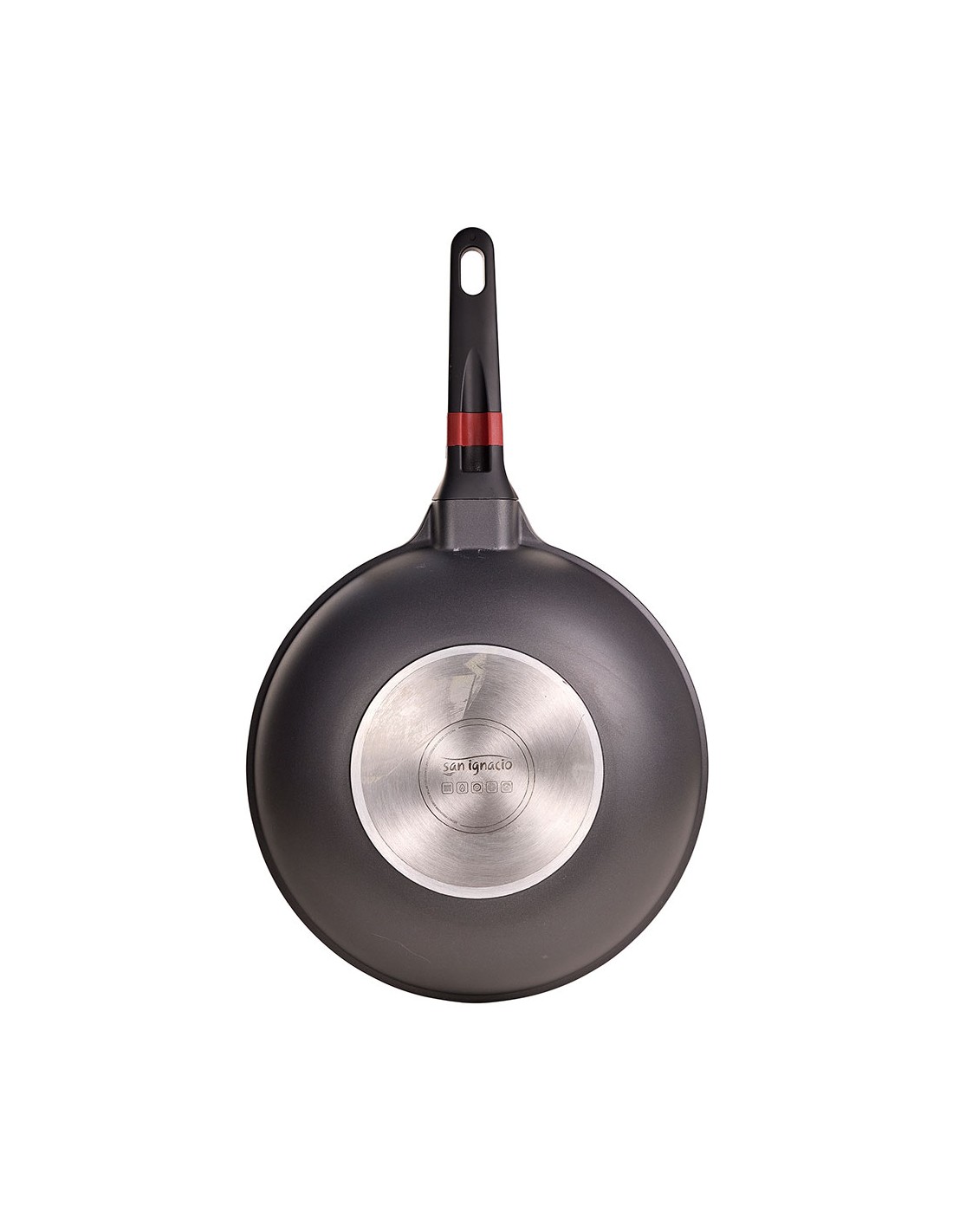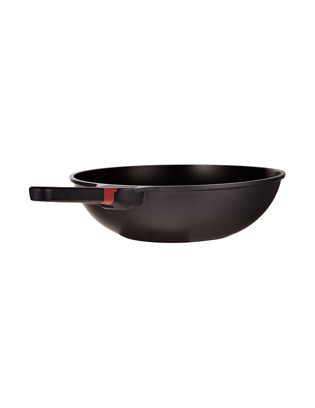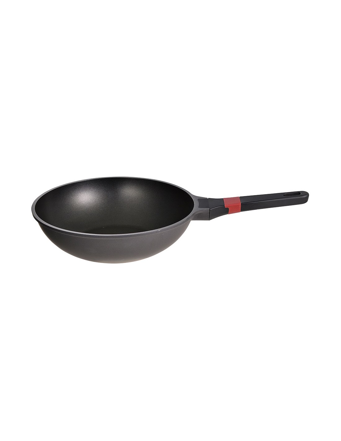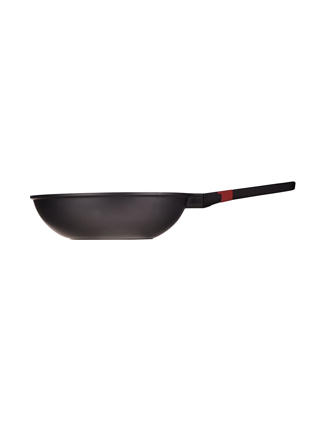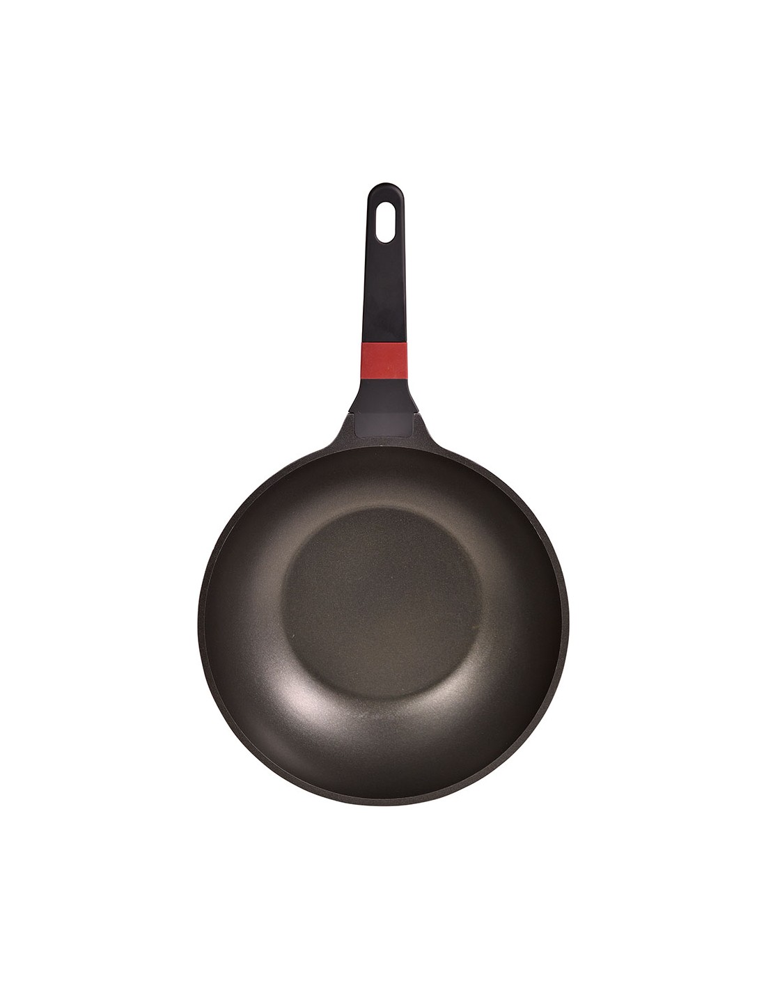 Wok de aluminio fundido, sin tapa, para inducción, interior con revestimiento ilag premium. mango de baquelita con tacto suave y línea de color rojo. ø28 x 8 cm