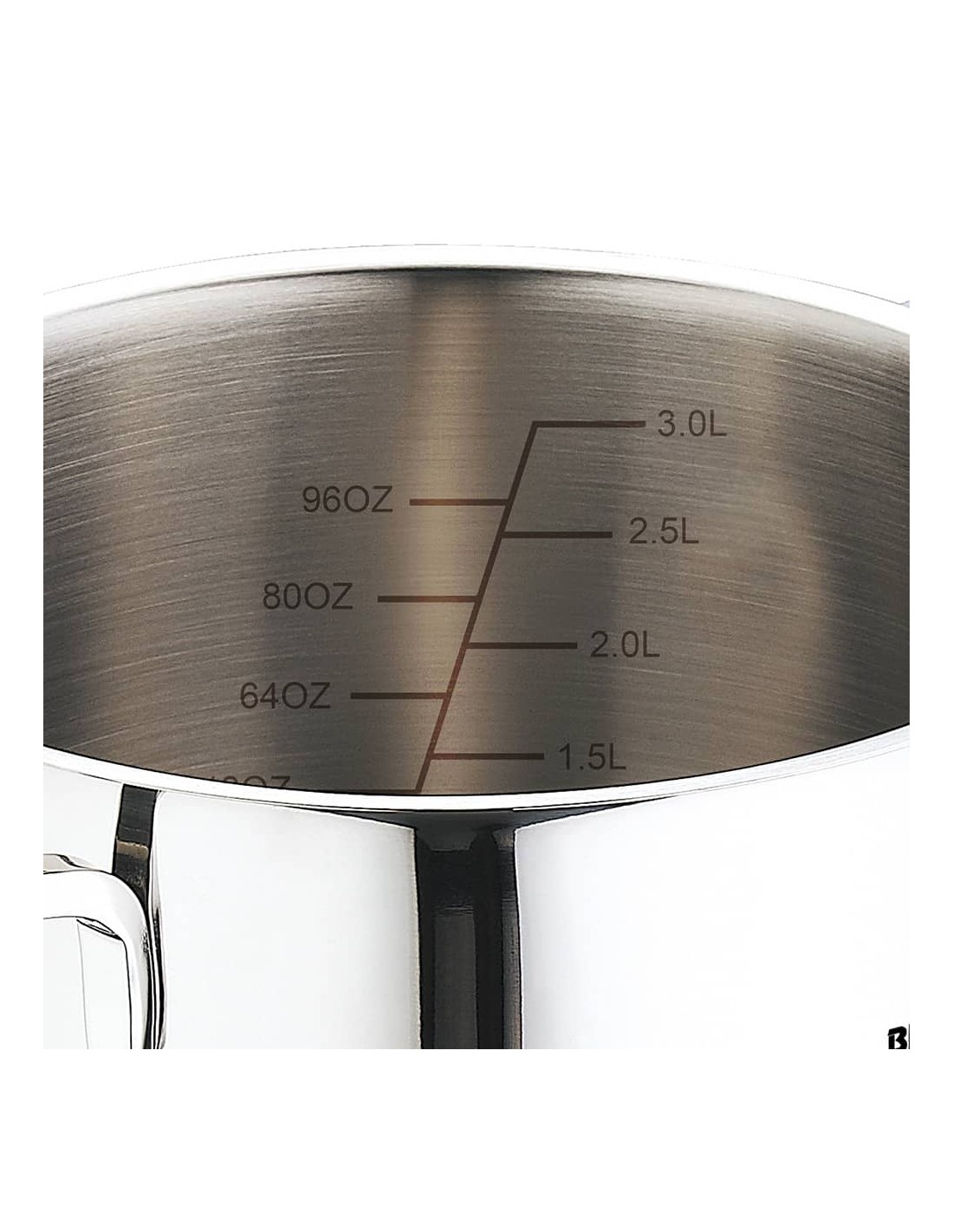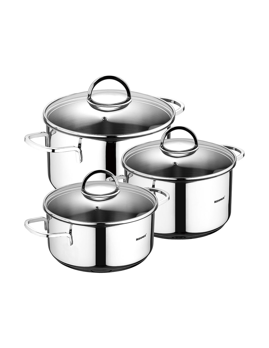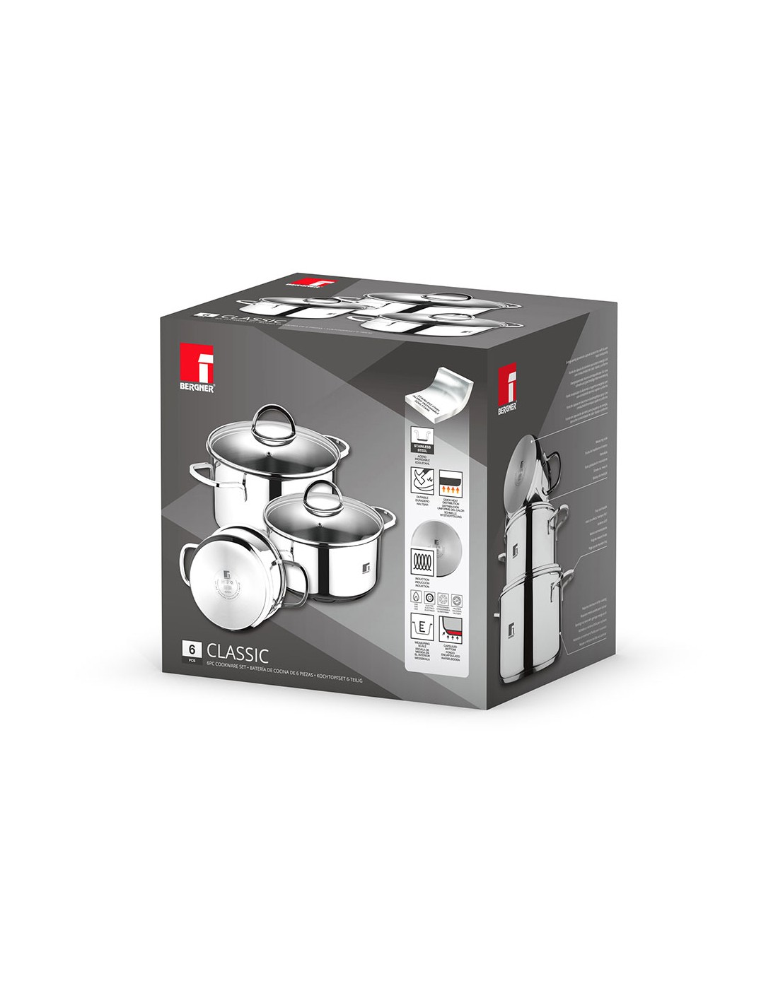 Batería 6 piezas de acero inoxidable para inducción, brillante mate, cuerpo con forma recta con borde cortado, asas con efecto siempre frío, con escala de medición, para todo tipo de fuegos, incluye: cazuela con tapa ø16 x 9,50 cm, 1,75 l / cazuela con tapa ø18 x 10,5 cm, 2,3 l / cazuela con tapa ø20 x 11,5 cm, 3,3 l
