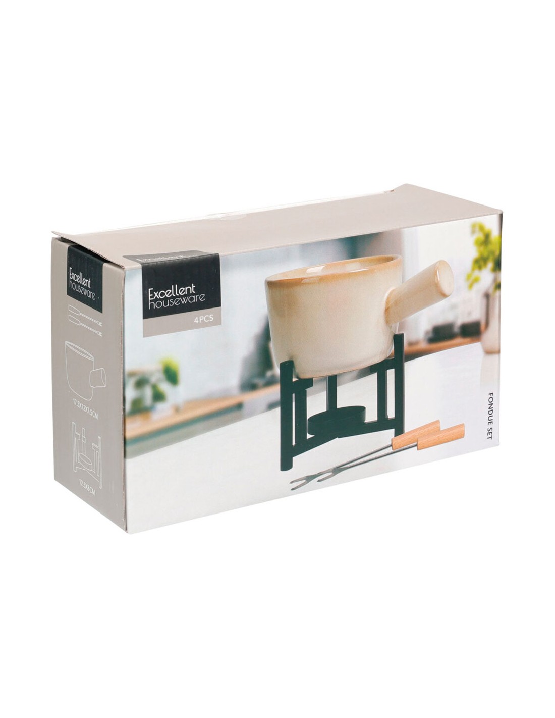 Fondue de porcelana, soporte metálico y 2 tenedores de acero inoxidable. medidas: cuenco 450 ml, ø12 x 7,5 cm con mango de 5 cm, soporte para vela: ø5 cm, soporte ø12 x 8 cm y 2 tenedores de 15 cm