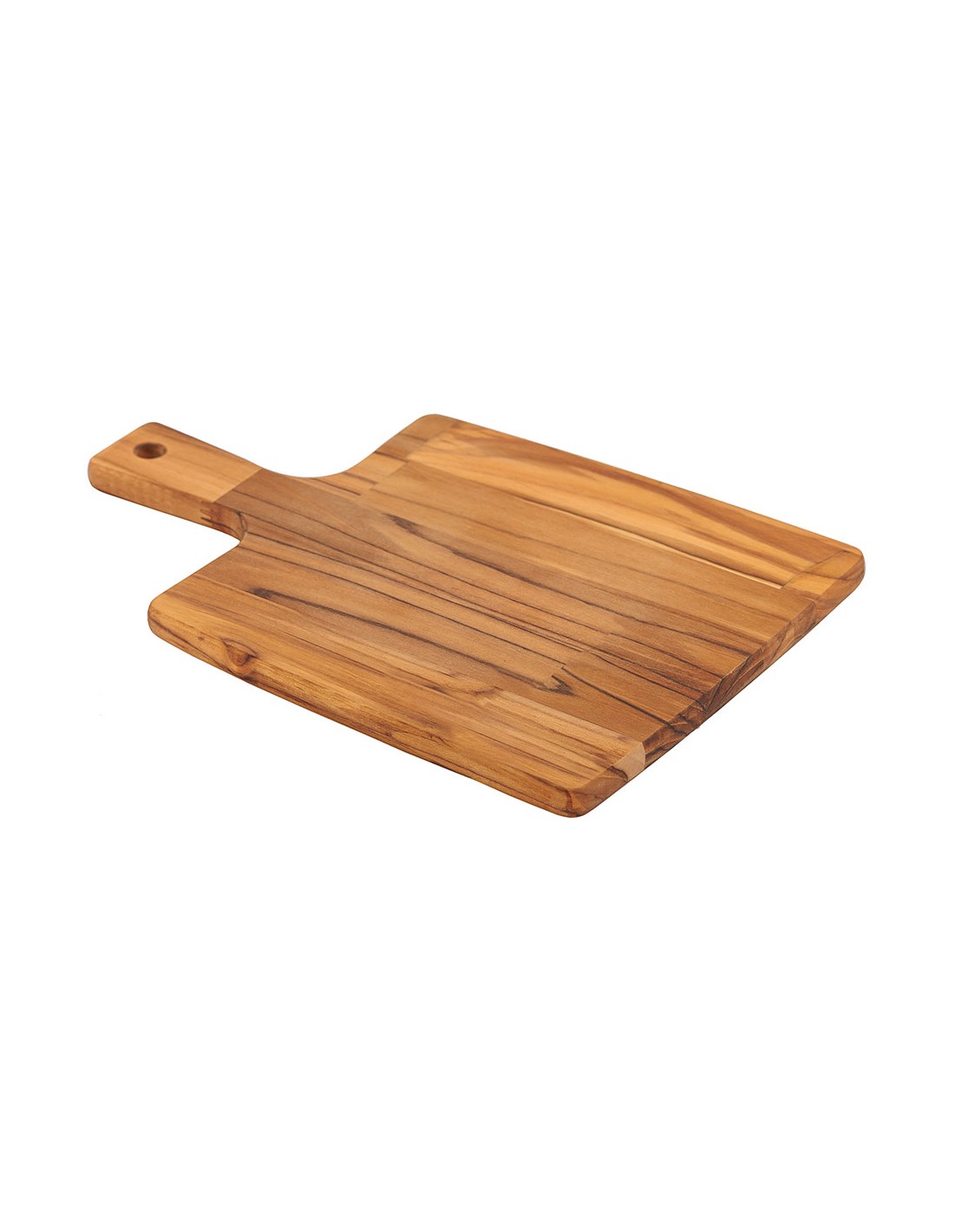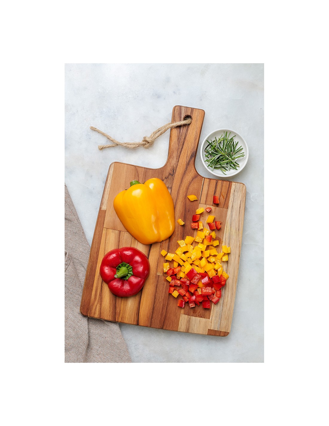 Tabla de cortar rectangular con mango integrado, fabricada en madera de teca fsc® con acabado en aceite mineral que garantiza durabilidad y resistencia. diseño rústico acompañado de una cuerda de sisal. dimensiones tabla: 24 x 23 x 1,8 cm, mango de 10 cm
