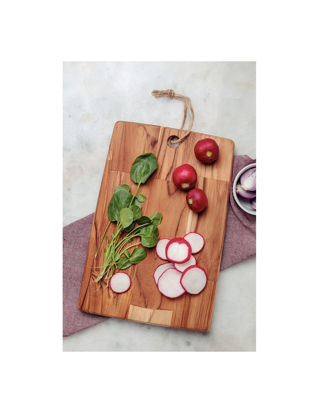 Tabla para cortar rectangular en madera de teca fsc®. destaca por su resistencia a la humedad y su acabado en aceite mineral, que protege la madera y realza su belleza natural. su diseño se completa con una cuerda de sisal que permite colgarla como elemento decorativo. dimensiones: 34 x 23 x 1,8 cm