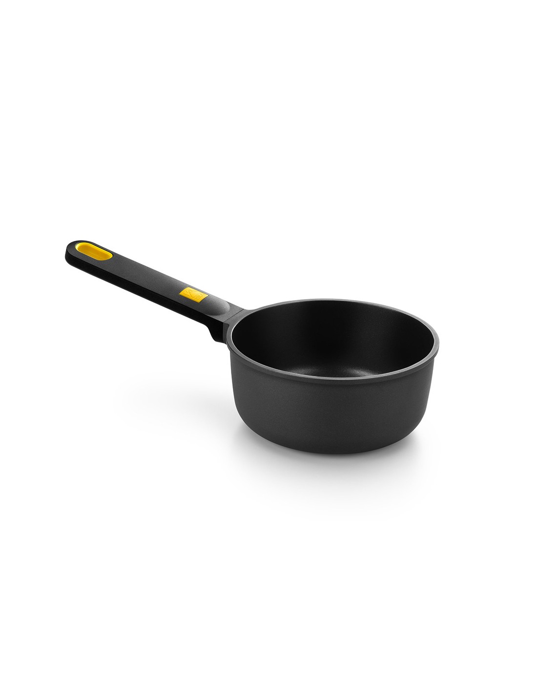 Cazo de aluminio fundido con antiadherente tricapa de gran calidad teflon innovation, libre de pfoa. apta para todas las fuentes de calor. mango negro de baquelita con insert de silicona en color amarillo. apta para lavavajillas