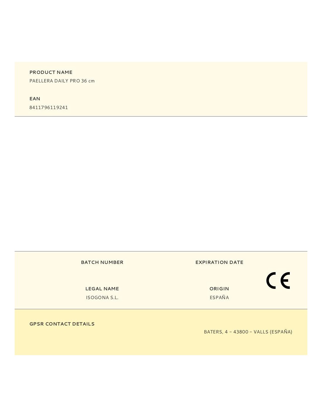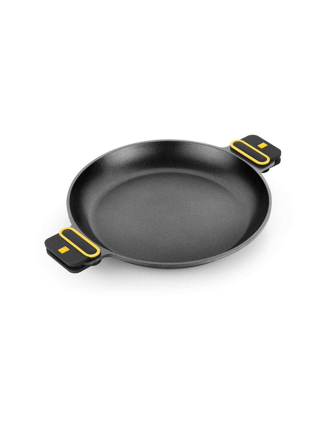 Paella de aluminio fundido con antiadherente tricapa de gran calidad teflon innovation, libre de pfoa. apta para todas las fuentes de calor. sus asas tienen unas agarraderas de silicona extraíbles, con detalles en color amarillo. apta para lavavajillas