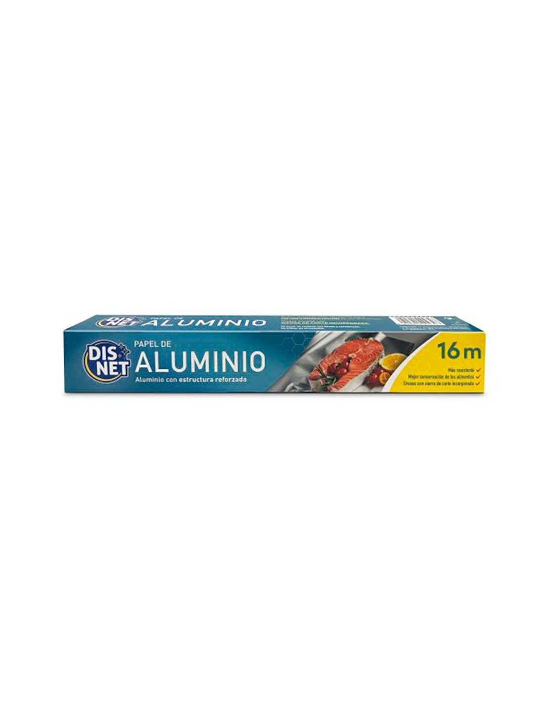 Papel de aluminio 16 m, diseñado para conservar alimentos, cocinar y proteger superficies, envase con sierra de corte incorporada