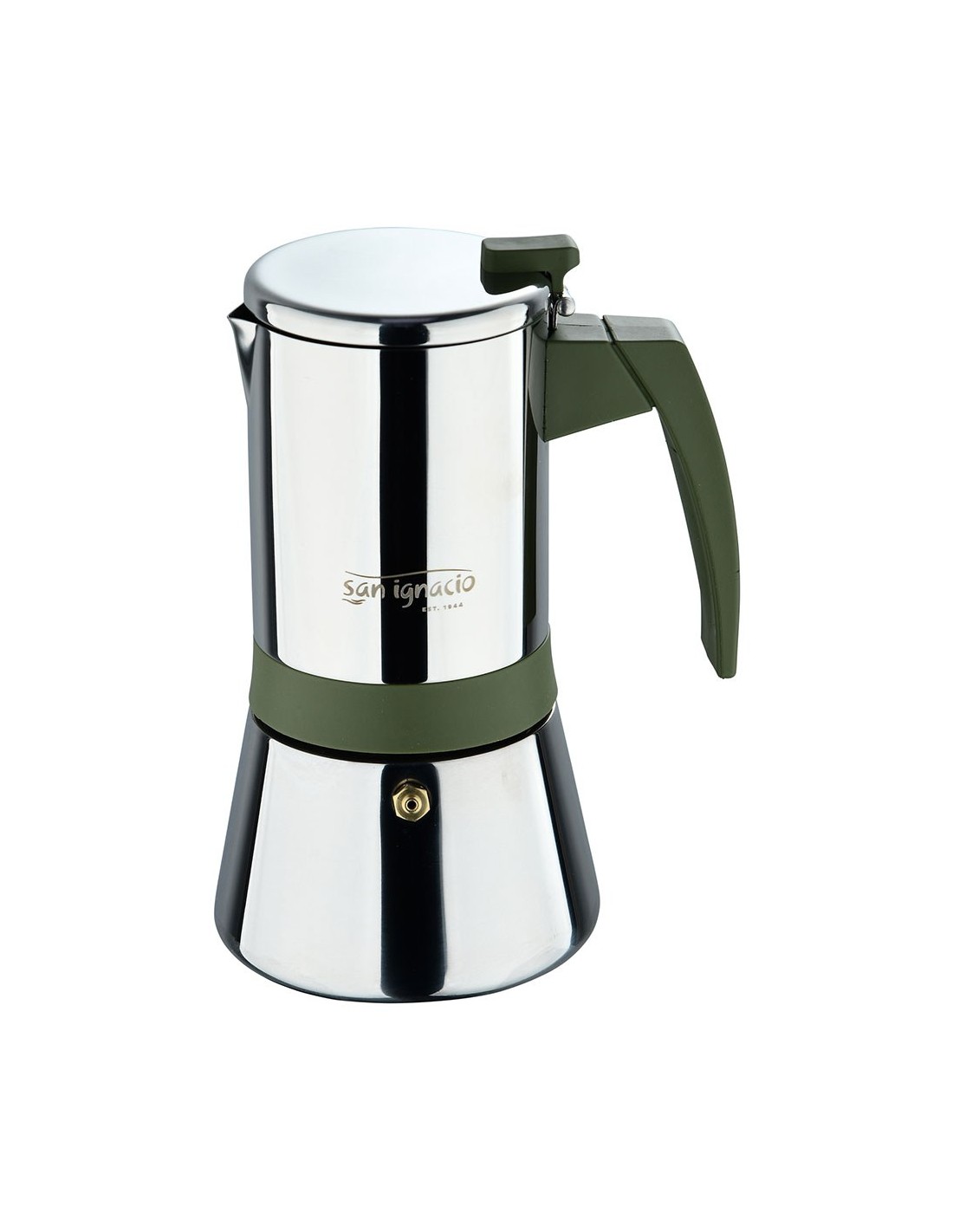 Cafetera de acero inoxidable, serie experto, 9 tazas, 450 ml. apta para inducción. pared simple con asa de nylon color verde oliva y parte central con envoltura de silicona en pq-7764c. ø12,5 x 22,5 cm