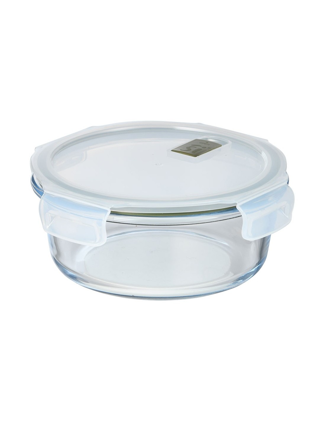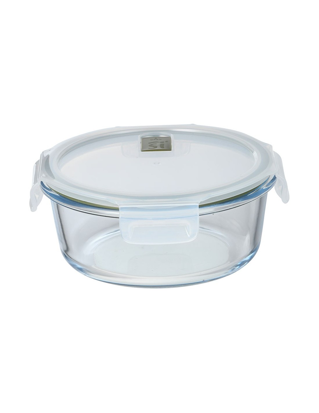 Fiambrera hermética de vidrio de borosilicato redonda, serie experto, tapa de pp transparente y silicona de color verde oliva, con 4 cierres y válvula de descompresión, apilable, apta para congelador, frigorífico y lavavajillas, apta sin la tapa para microondas y horno, 950 ml, ø18,4 x 7,6 cm