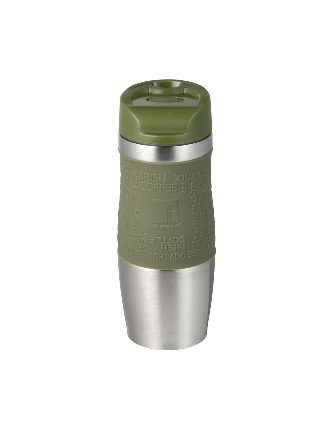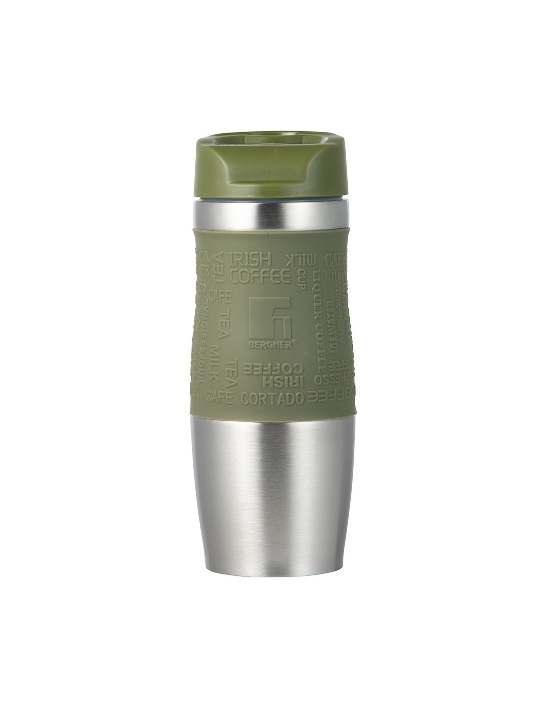 Vaso de viaje, serie experto, de acero inoxidable con funda de silicona verde oliva, de doble pared, con tapa de pp y base de goma antideslizante, sistema de apertura por pulsación a una sola mano, 360 ml, ø8,3 x 21,2 cm, presentado en expositor de 8 uds