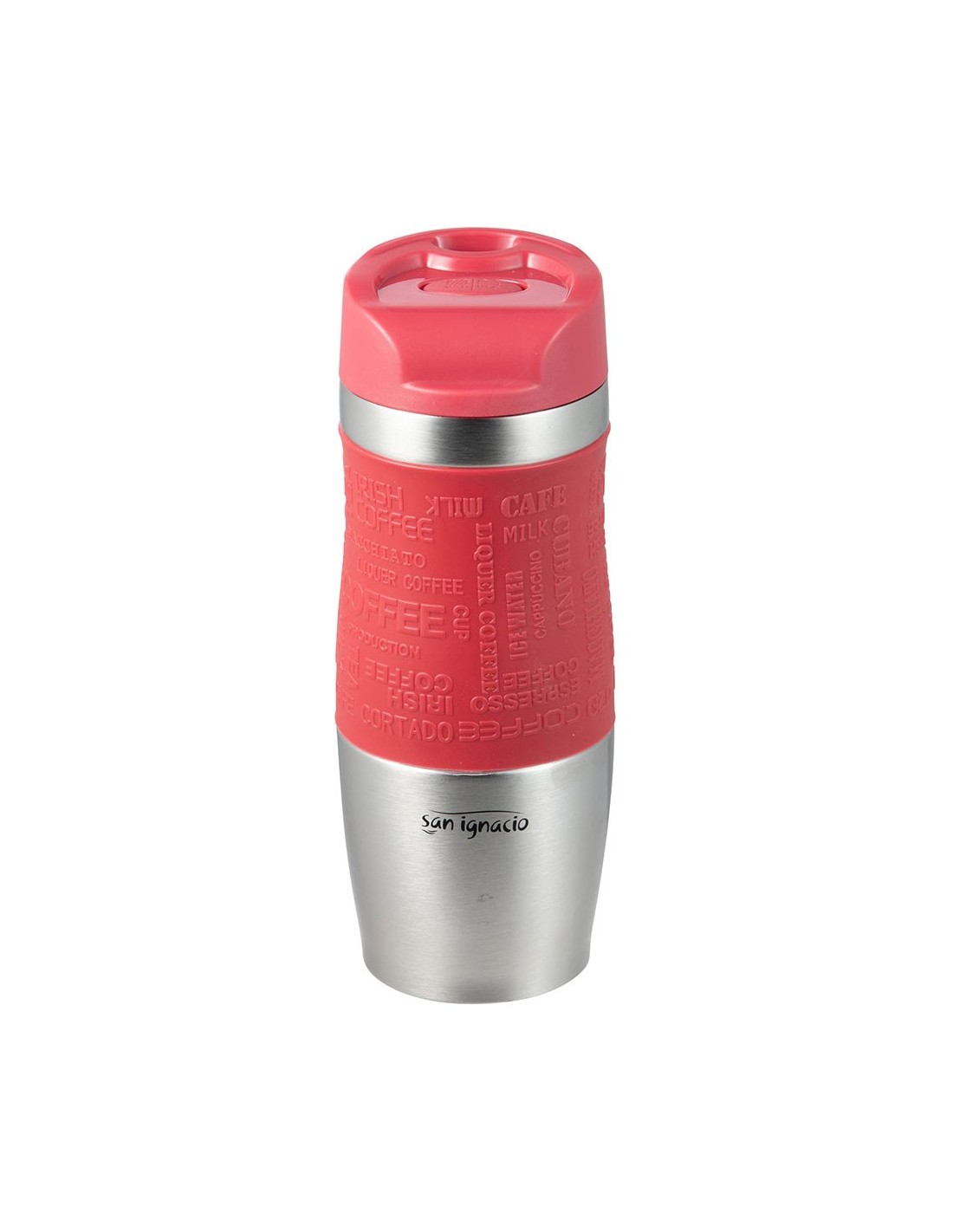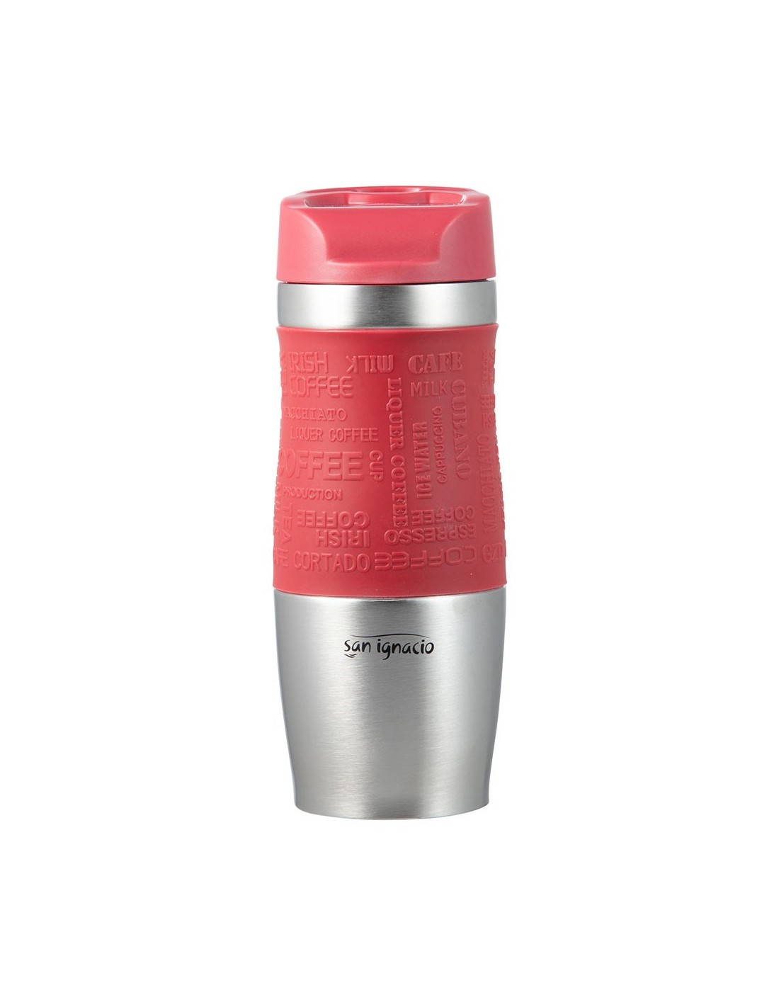 Vaso de viaje, serie experto, de acero inoxidable con funda de silicona roja mate, de doble pared, con tapa de pp y base de goma antideslizante, sistema de apertura por pulsación a una sola mano, 360 ml. ø8,3 x 21,2 cm. presentado en expositor de 8 uds