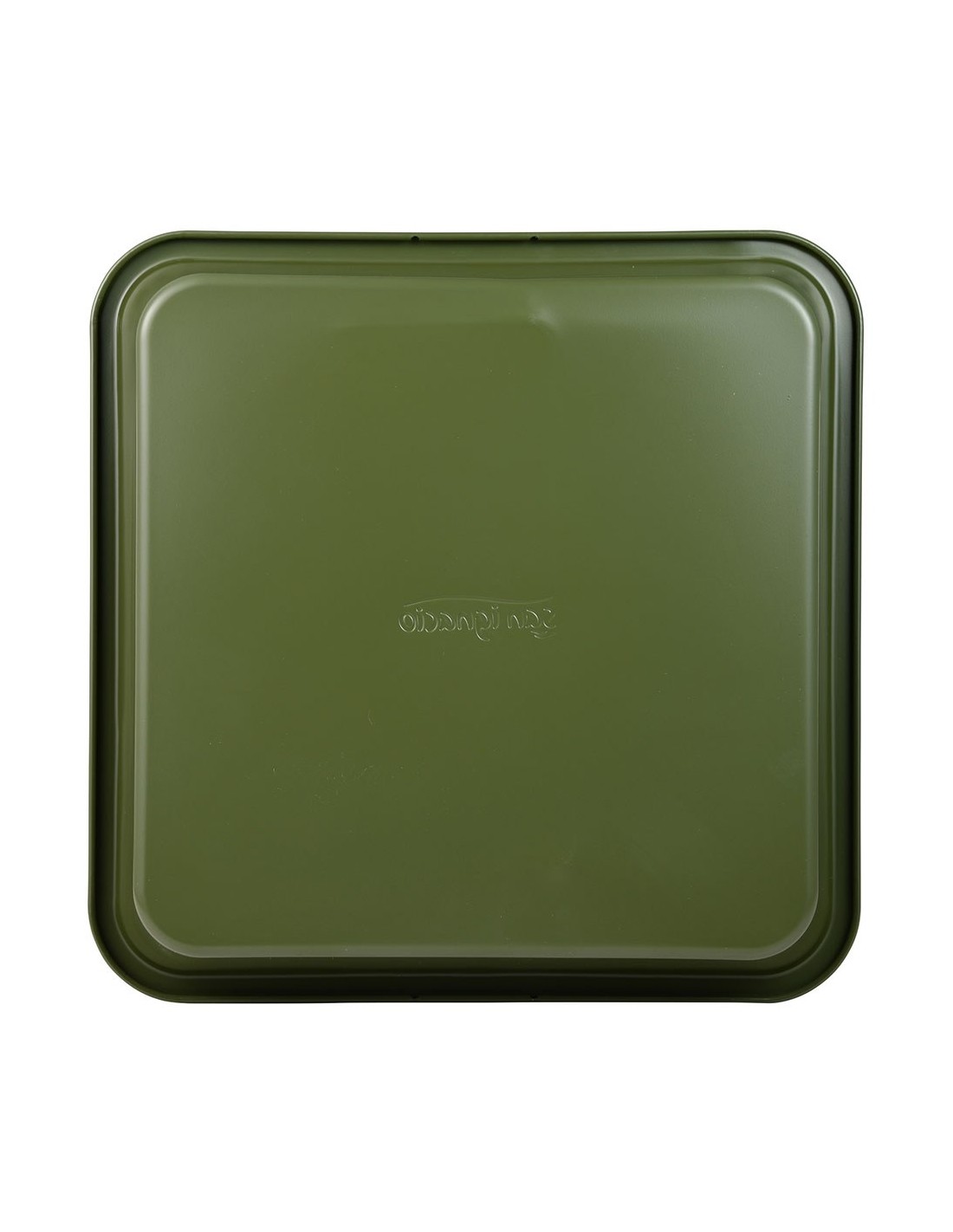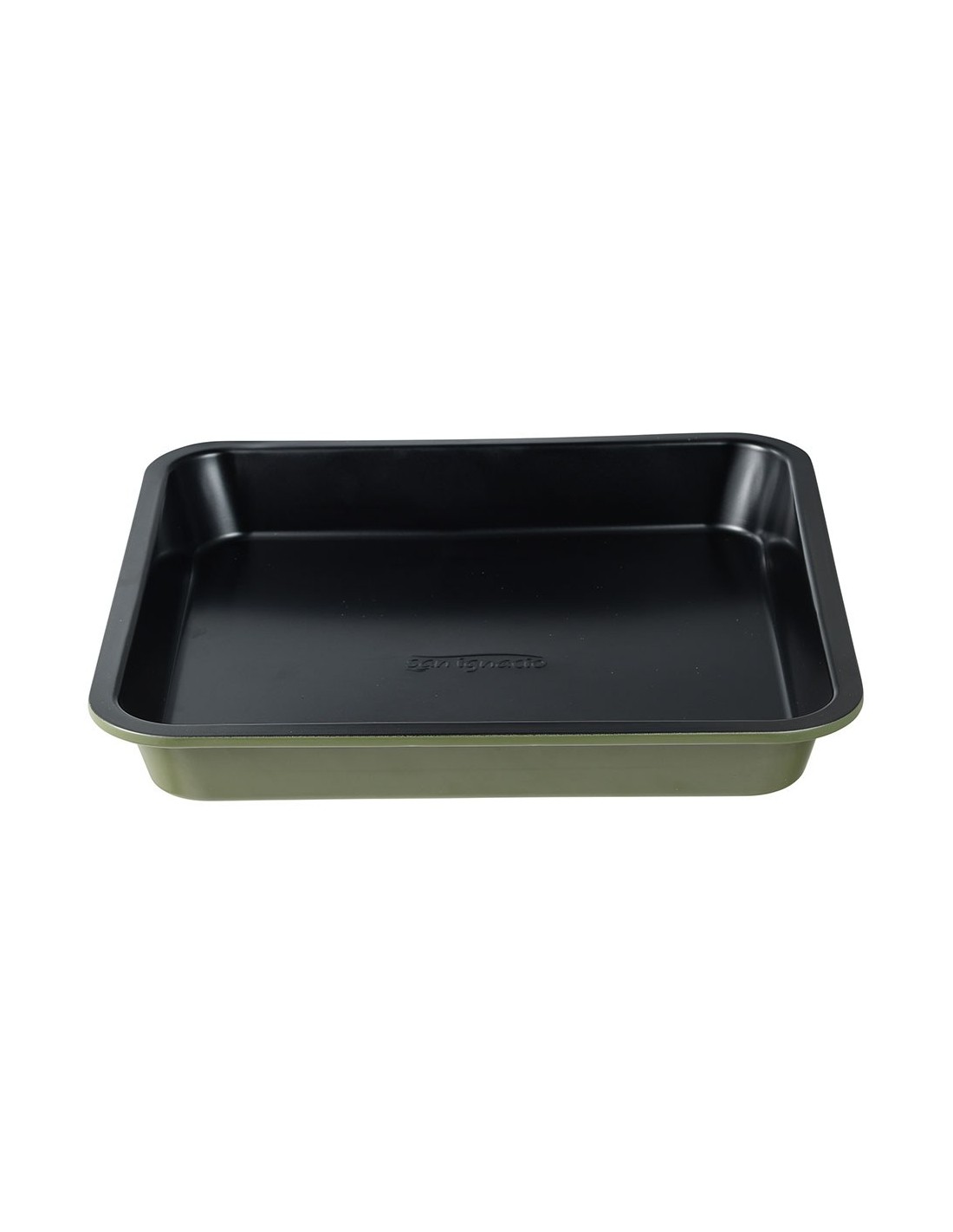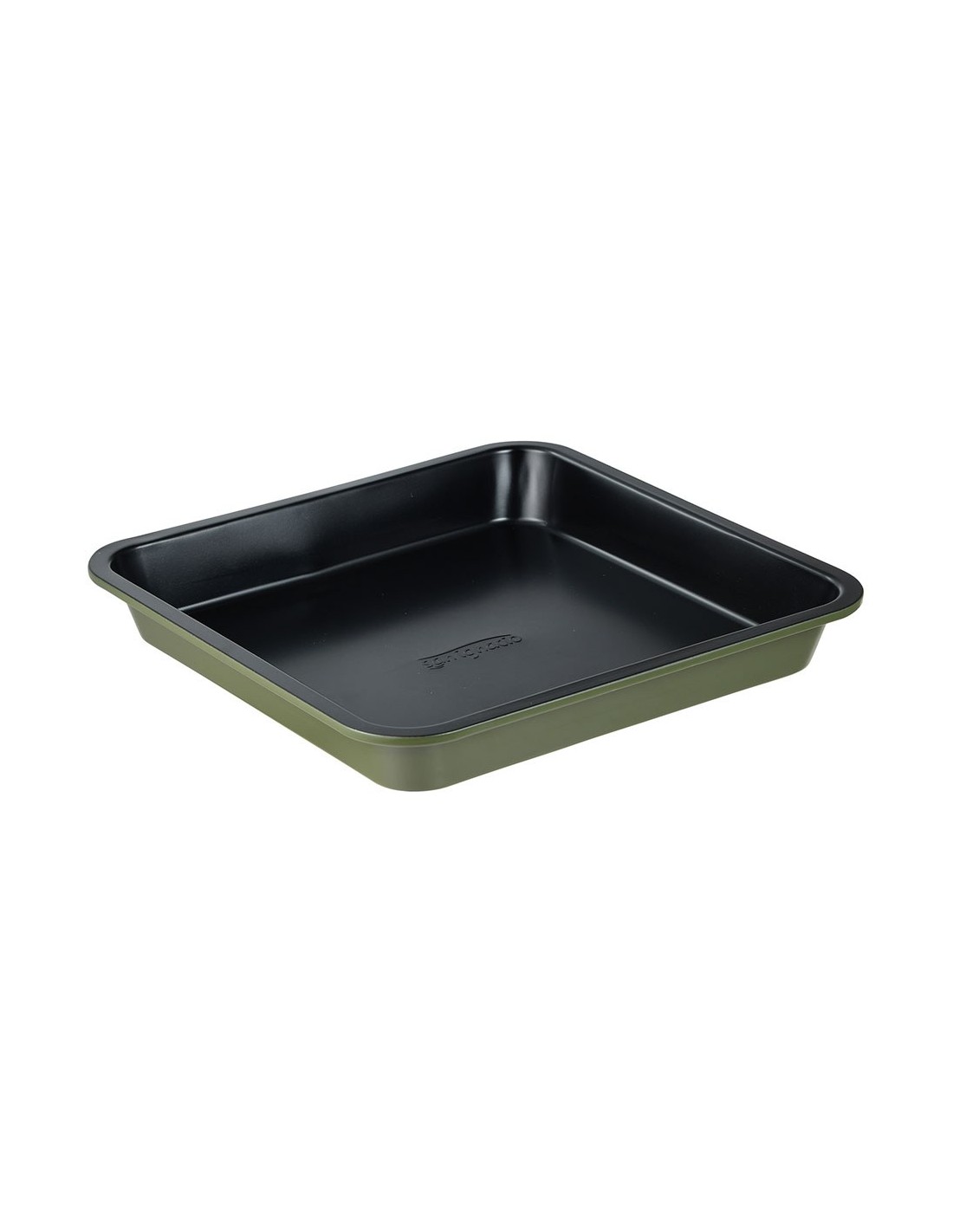 Bandeja cuadrada, serie experto, de acero al carbono, para horno. revestimiento interior antiadherente negro. revestimiento exterior en pq-7764c. color verde oliva. 26 x 26 x 3,5 cm