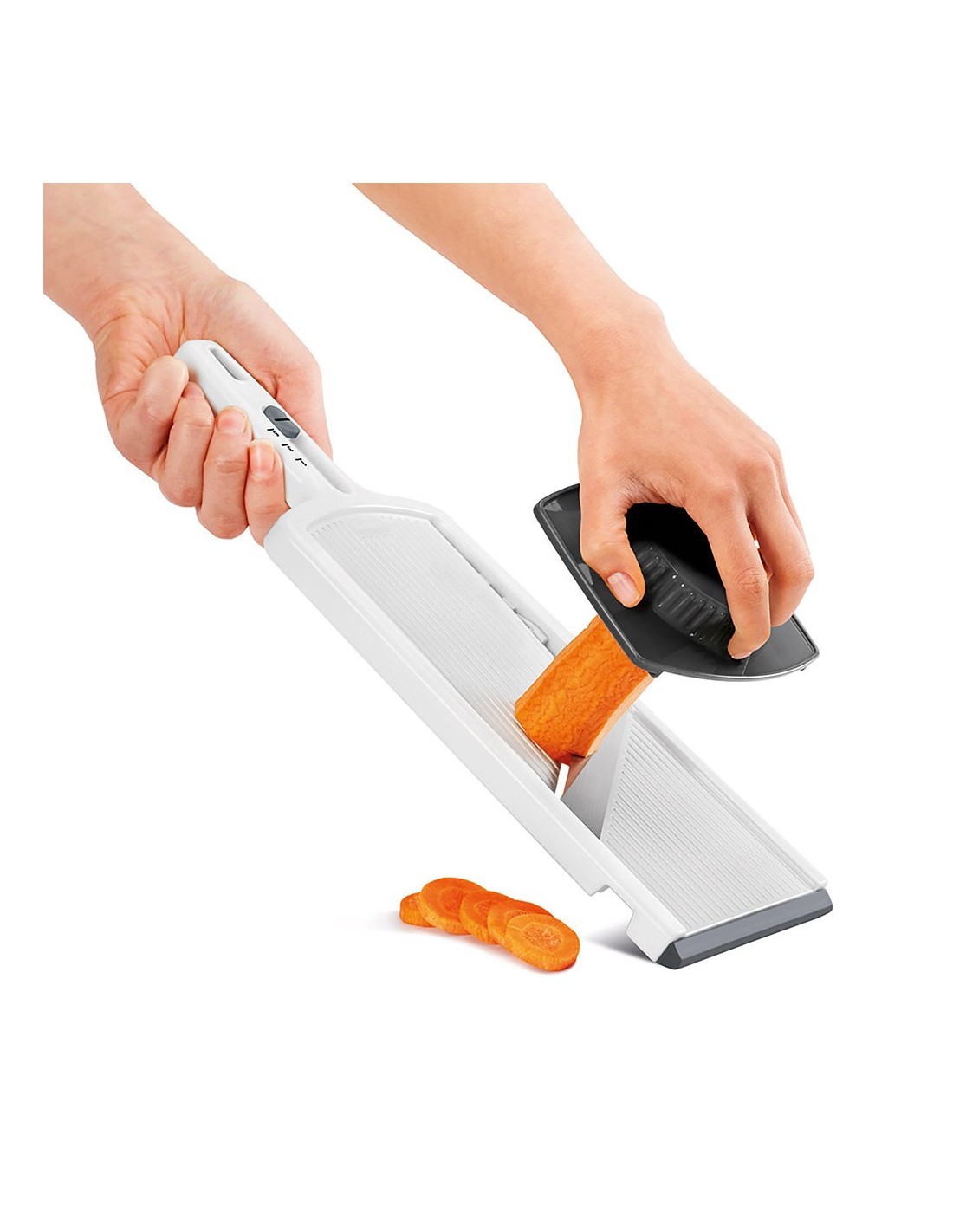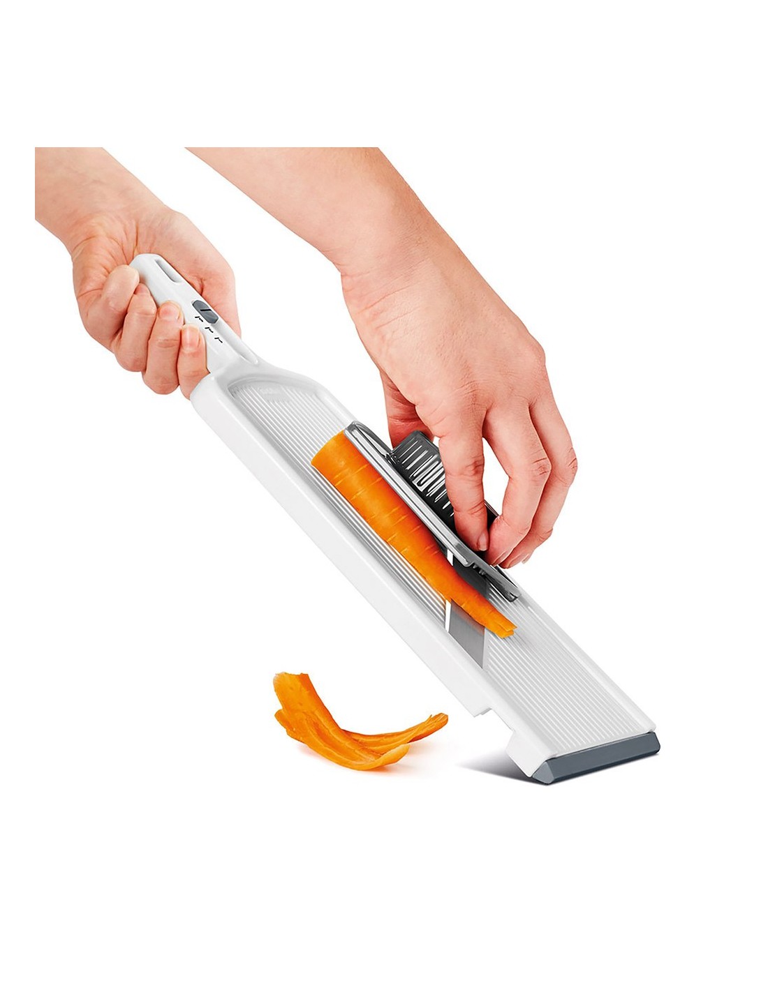 Cortador de verduras, slice-6, con mango ergonómico y protector. fabricado en abs y cuchillas de acero inoxidable. permite cortar en 6 grosores diferentes de 1 a 6 mm. sistema de bloqueo y base antideslizante. medidas: 32 x 12 x 3,5 cm