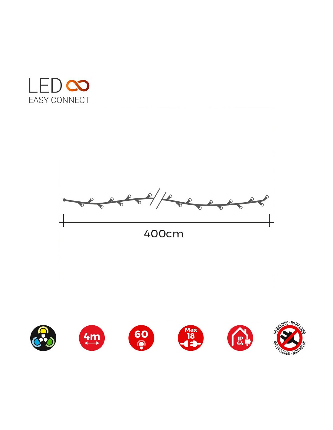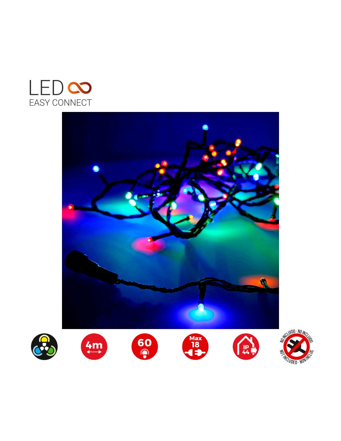 Guirnalda easy-connect 4m, 60 leds multicolor,30v, ip44, cable verde, n° interconexiones max. entre cortinas 18, no incluye transformador(este se puede adquirir segun sus necesidades: una cortina de funcion fija o multifuncion) interior-exterior,total 1.08w
