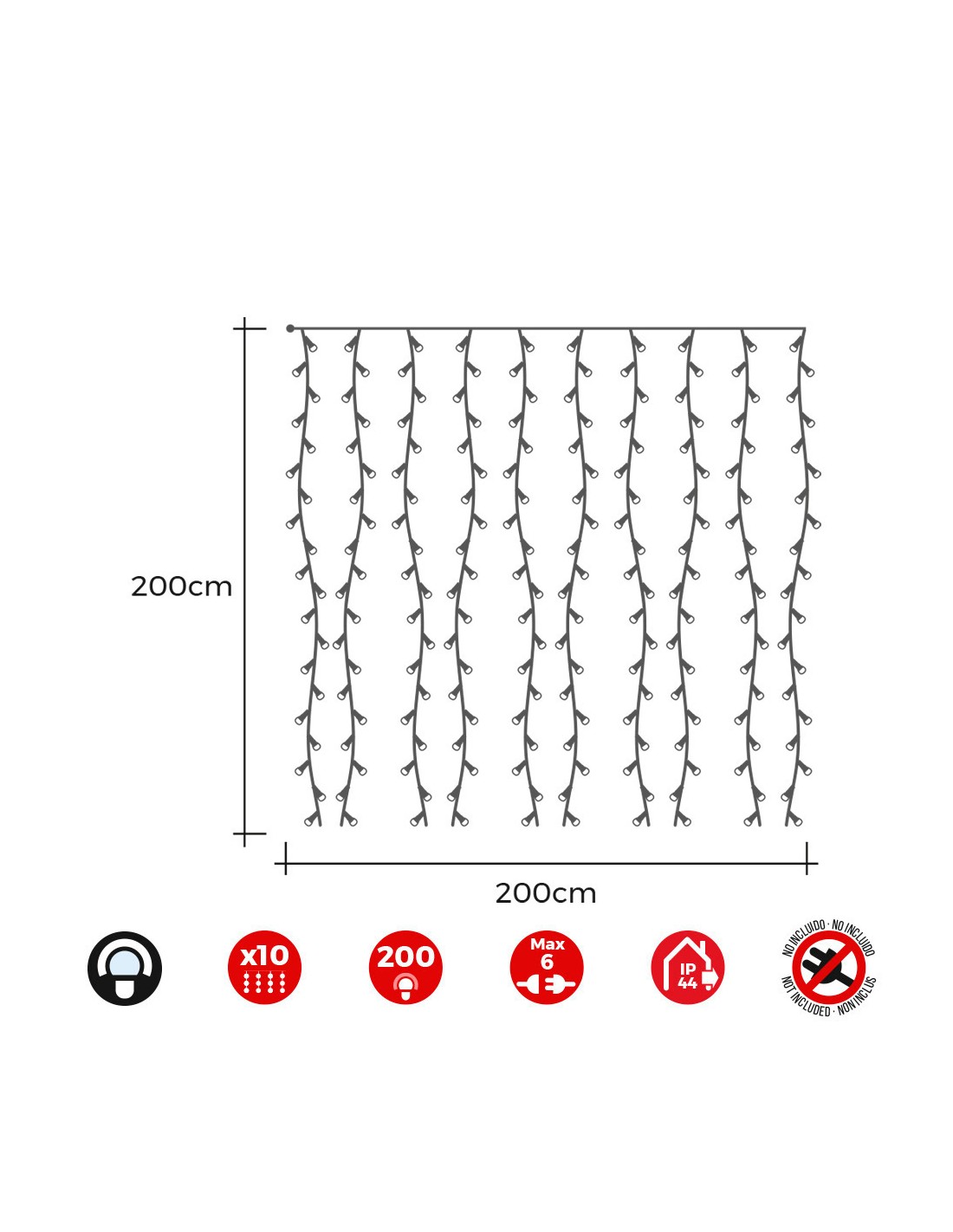 Cortina led easy-connect, 2x2m, 10 tiras, 200 leds, blanco frío, 30v, 3,2w, cable verde, número de interconexiones máximo entre cortinas 6, interior-exterior ip44, no incluye transformador, este se puede adquirir segun sus necesidades: una cortina de función fija o multifunción