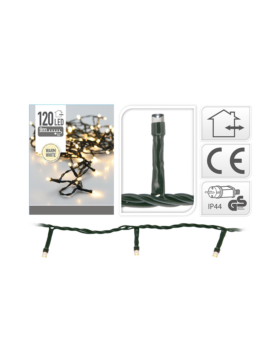 Guirnalda fija 120 leds luz cálida, 220 - 240 v 50/60 hz, exterior ip44, cable verde, distancia entre bombillas 7,5 cm, distancia entre la primera bombilla y la última 9 m, cable alimentación 3 m, largo total: 12 m