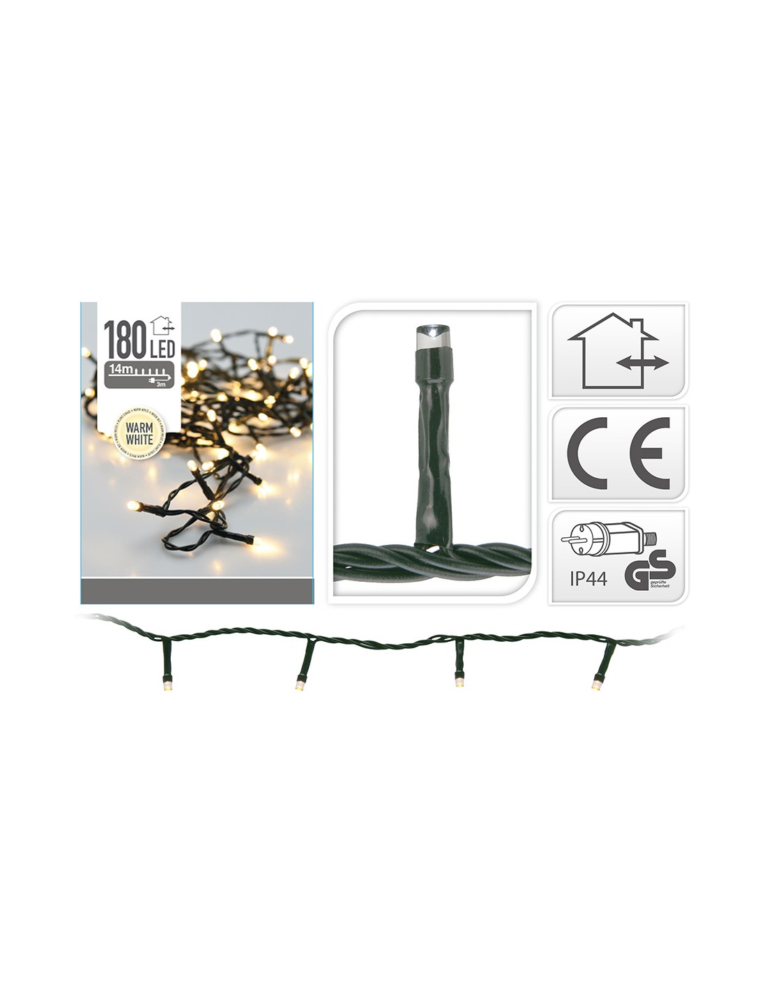 Guirnalda fija 180 leds luz cálida, 220 - 240 v 50/60 hz, exterior ip44, cable verde, distancia entre bombillas 7,5 cm, distancia entre la primera bombilla y la última 13,5 m, cable alimentación 3 m, largo total: 16,5 m