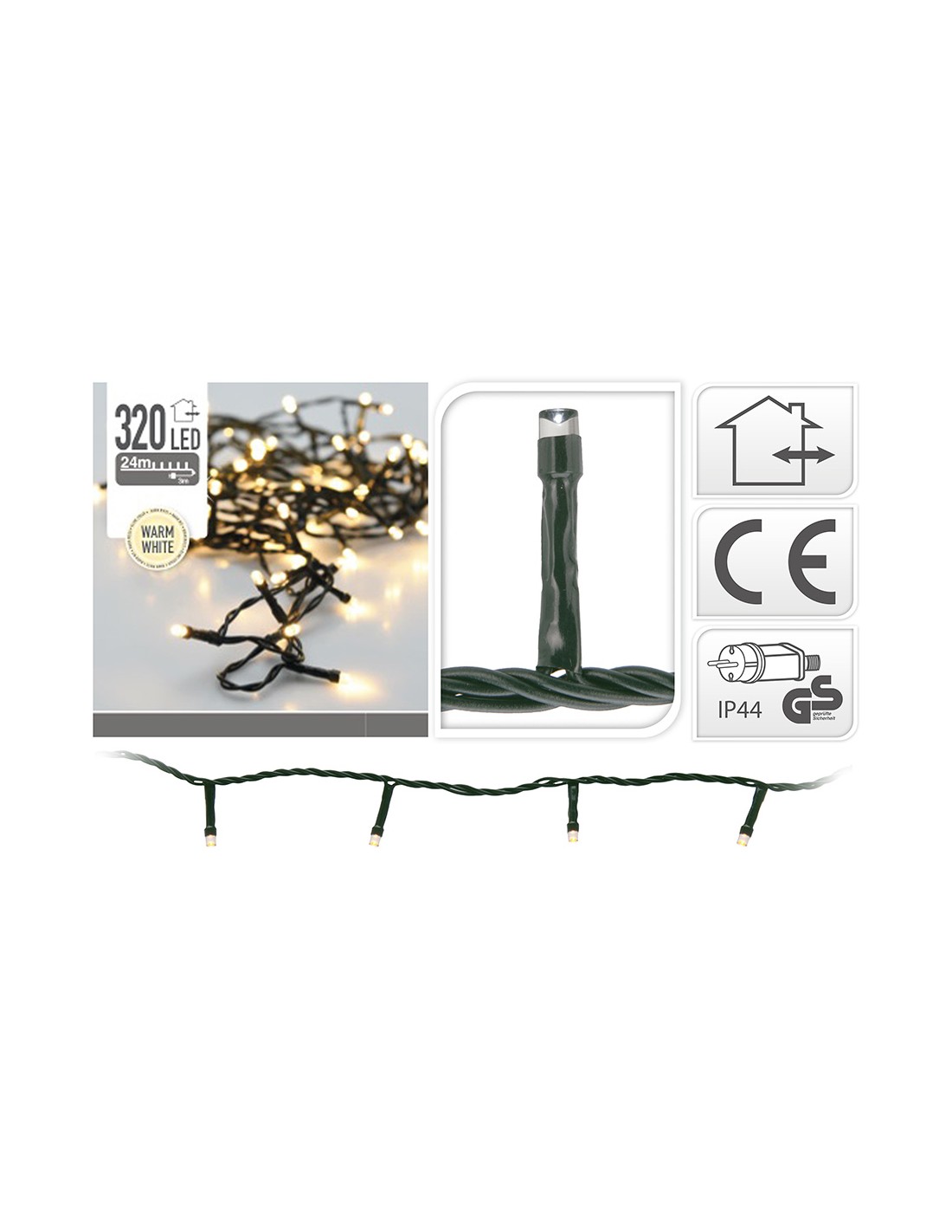 Guirnalda fija 320 leds luz cálida, 220 - 240 v 50/60 hz, exterior ip44, cable verde, distancia entre bombillas 7,5 cm, distancia entre la primera bombilla y la última 24 m, cable alimentación 3 m, largo total: 27 m