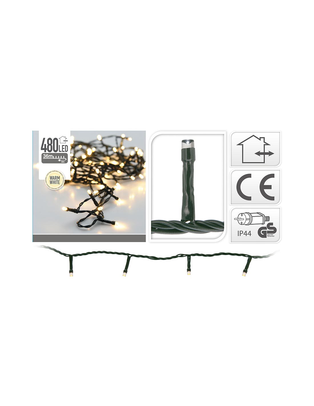 Guirnalda fija 480 leds luz cálida, 220 - 240 v 50/60 hz, exterior ip44, cable verde, distancia entre bombillas 7,5 cm, distancia entre la primera bombilla y la última 36 m, cable alimentación 3 m, largo total: 39 m