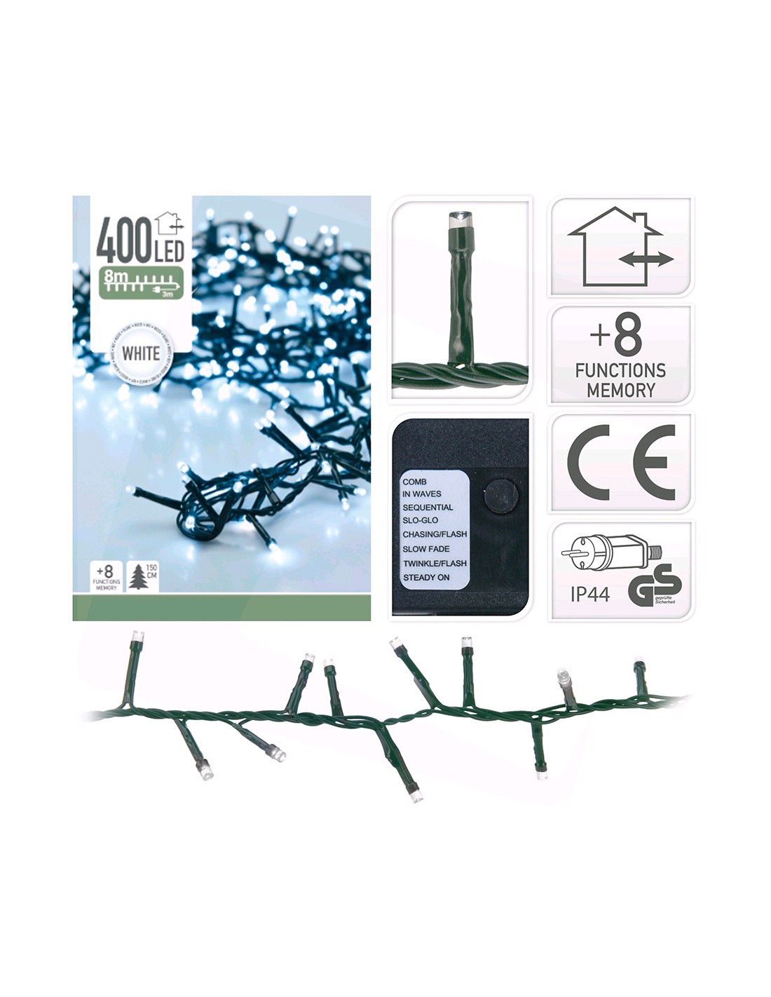 Guirnalda "tipo espino" 400 leds, luz fría, 220 - 240 v 50/60 hz, exterior ip44, cable verde, con 8 funciones de efecto intermitente, incluyendo modo fijo, temporizador: 8 h encendido / 16 h apagado, distancia entre bombillas 2 cm, distancia entre la primera bombilla y la última 8 m, cable alimentación 3 m, largo total: 11 m, para árbol de 150 cm