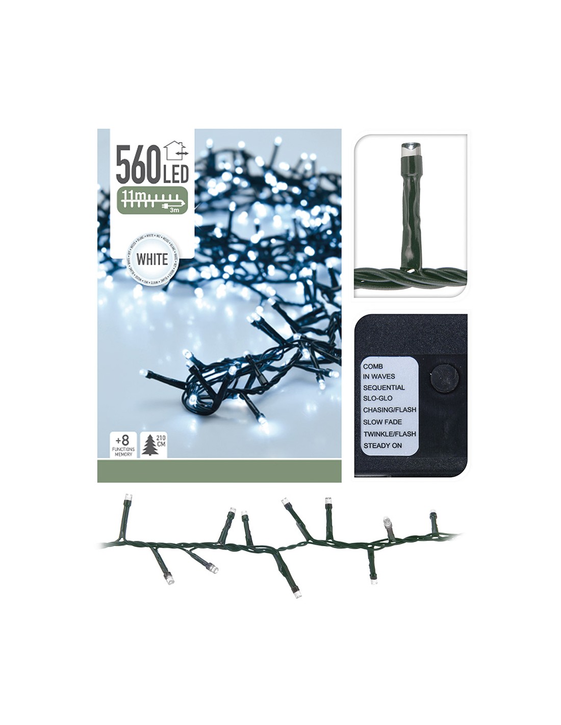 Guirnalda "tipo espino" 560 leds, luz fría, 220 - 240 v 50/60 hz, exterior ip44, cable verde, con 8 funciones de efecto intermitente, incluyendo modo fijo, temporizador: 8 h encendido / 16 h apagado, distancia entre bombillas 2 cm, distancia entre la primera bombilla y la última 11 m, cable alimentación 3 m, largo total: 14 m, para árbol de 180 cm