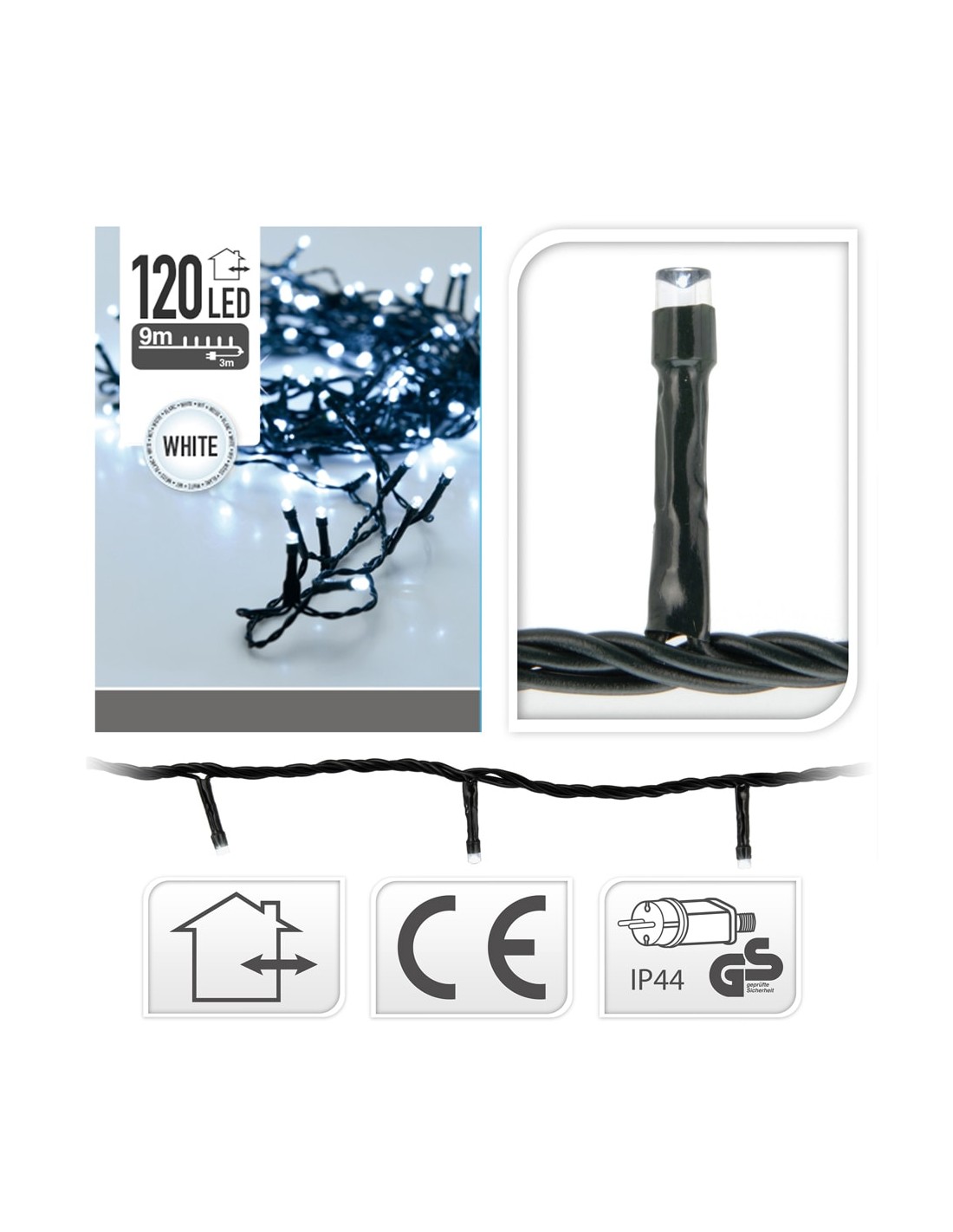 Guirnalda fija 120 leds luz fría, 220 - 240 v 50/60 hz, exterior ip44, cable verde, distancia entre bombillas 7,5 cm, distancia entre la primera bombilla y la última 9 m, cable alimentación 3 m, largo total: 12 m
