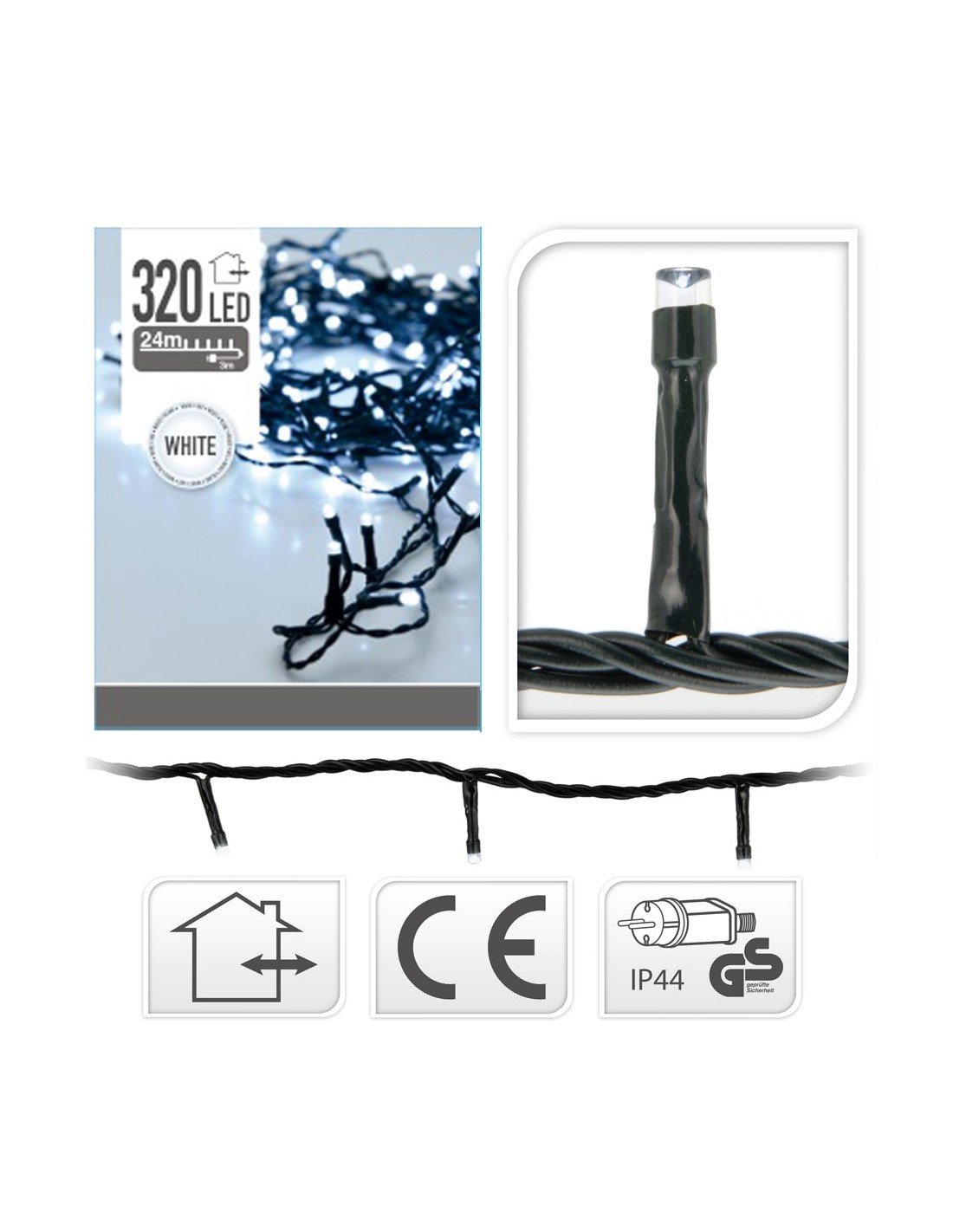 Guirnalda fija 320 leds luz fría, 220 - 240 v 50/60 hz, exterior ip44, cable verde, distancia entre bombillas 7,5 cm, distancia entre la primera bombilla y la última 24 m, cable alimentación 3 m, largo total: 27 m