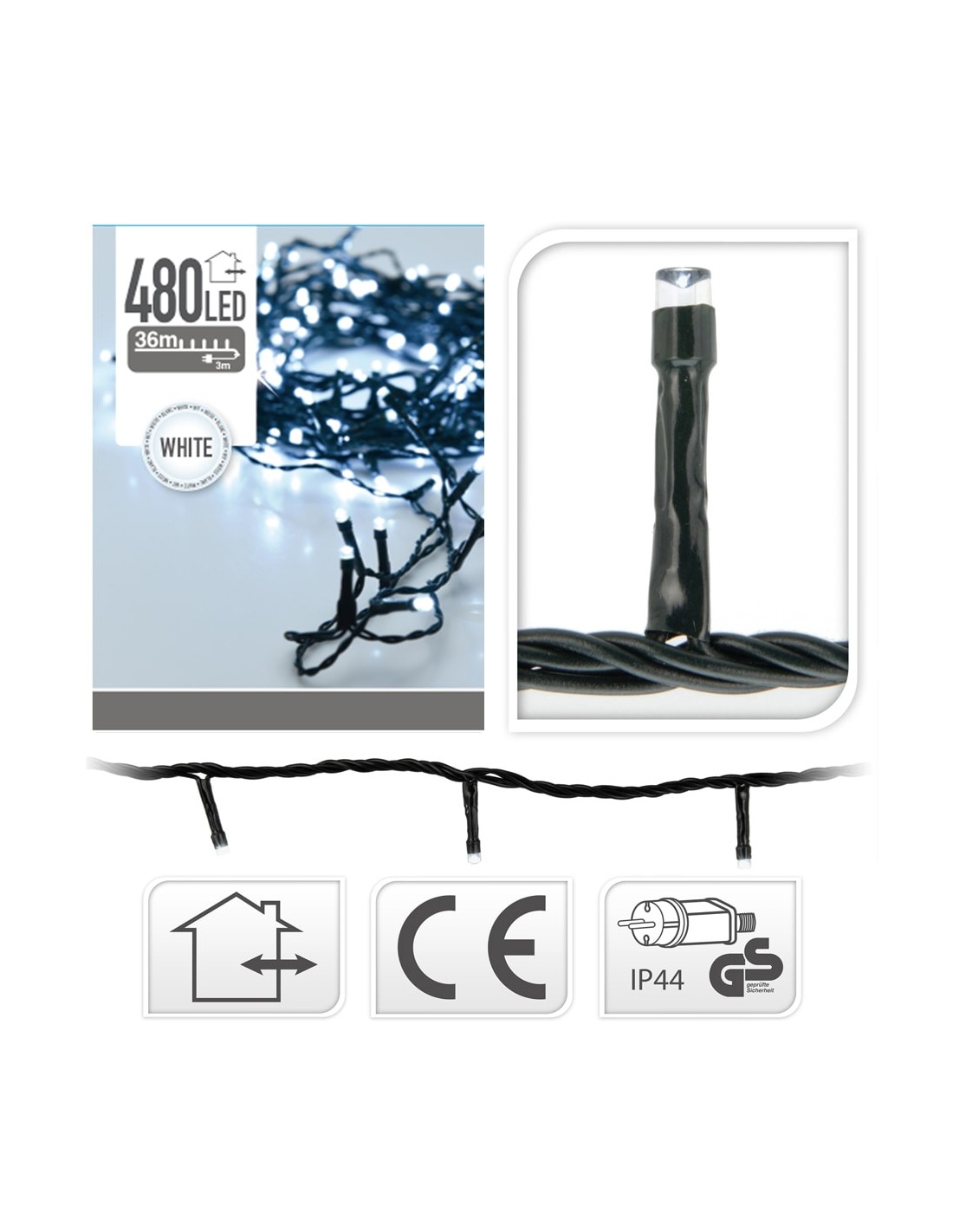 Guirnalda fija 480 leds luz fría, 220 - 240 v 50/60 hz, exterior ip44, cable verde, distancia entre bombillas 7,5 cm, distancia entre la primera bombilla y la última 36 m, cable alimentación 3 m, largo total: 39 m