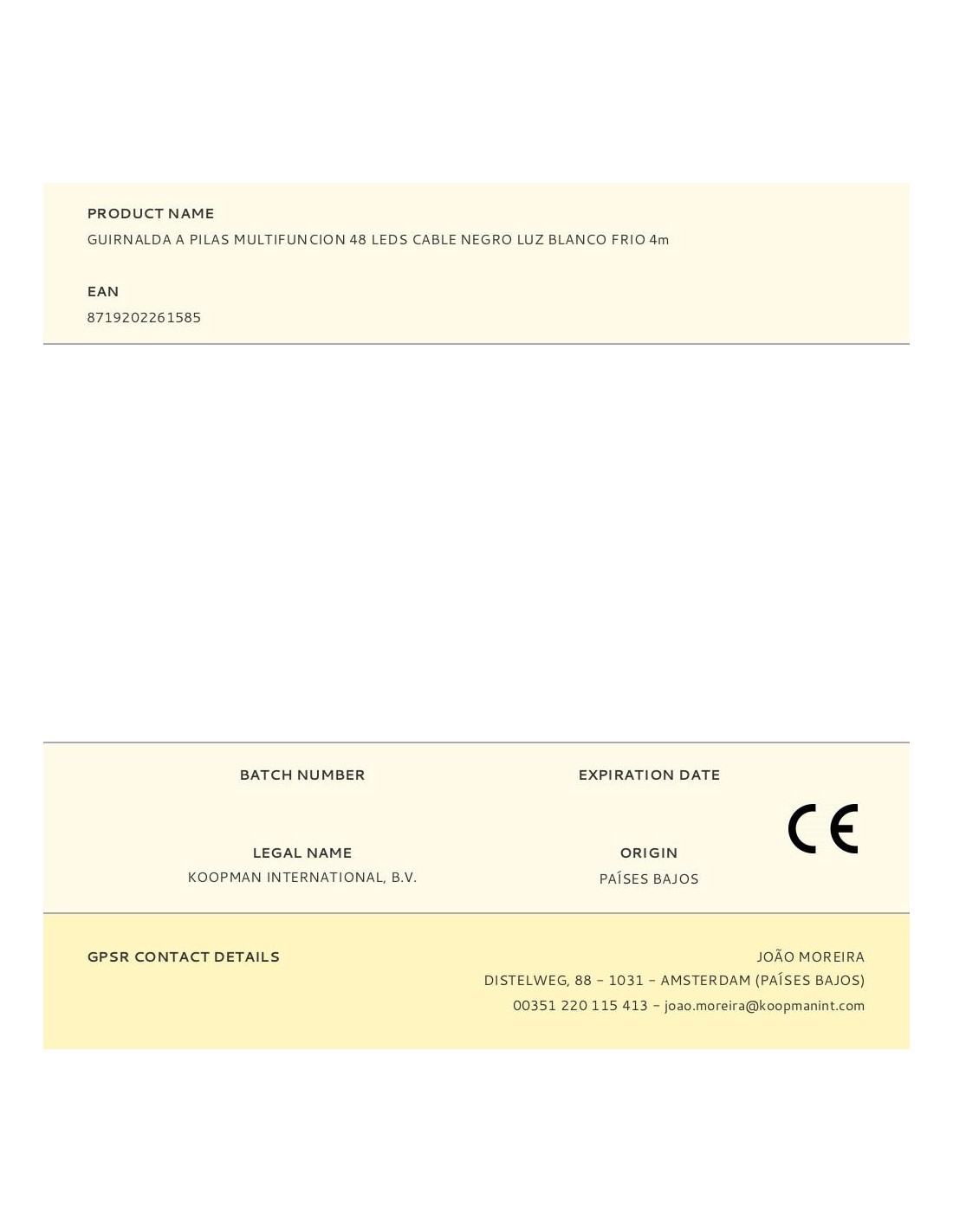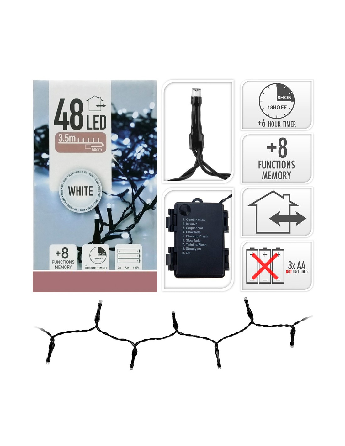 Guirnalda a pilas multifuncion 48 leds cable negro luz blanco frio pilas 3xaa no incluidas ip44 7,5cm entre bombillas programador 8 funciones con memoria + temporizador 6h encendido 18h apagado. cable alimentación 50cm. distancia entre la primera bombilla y la ultima 3,50m. largo total: 4m