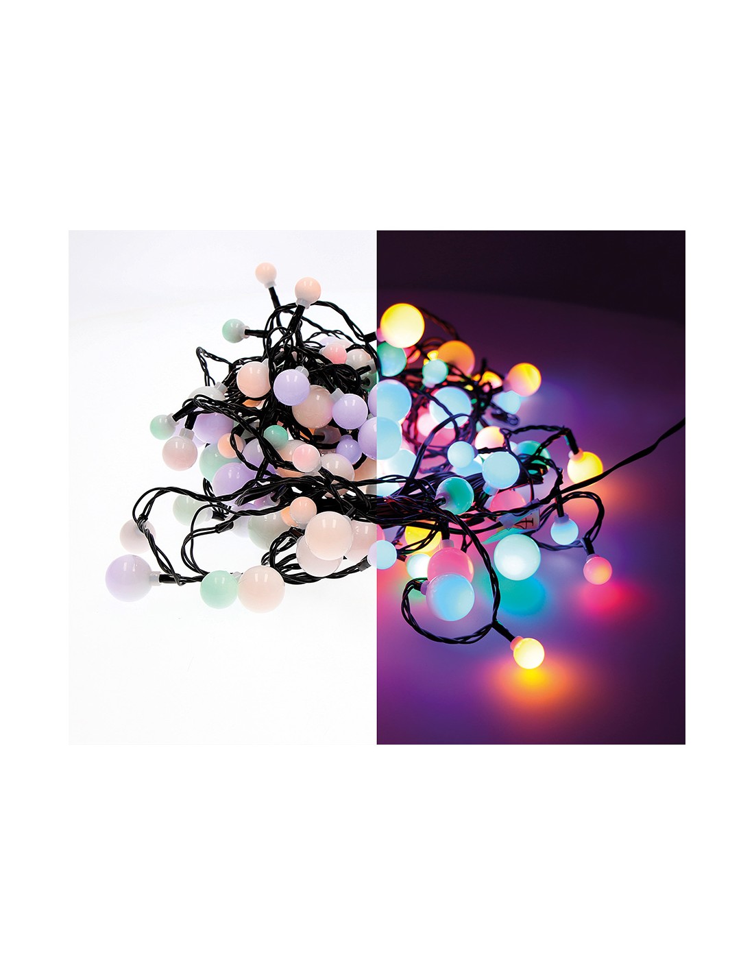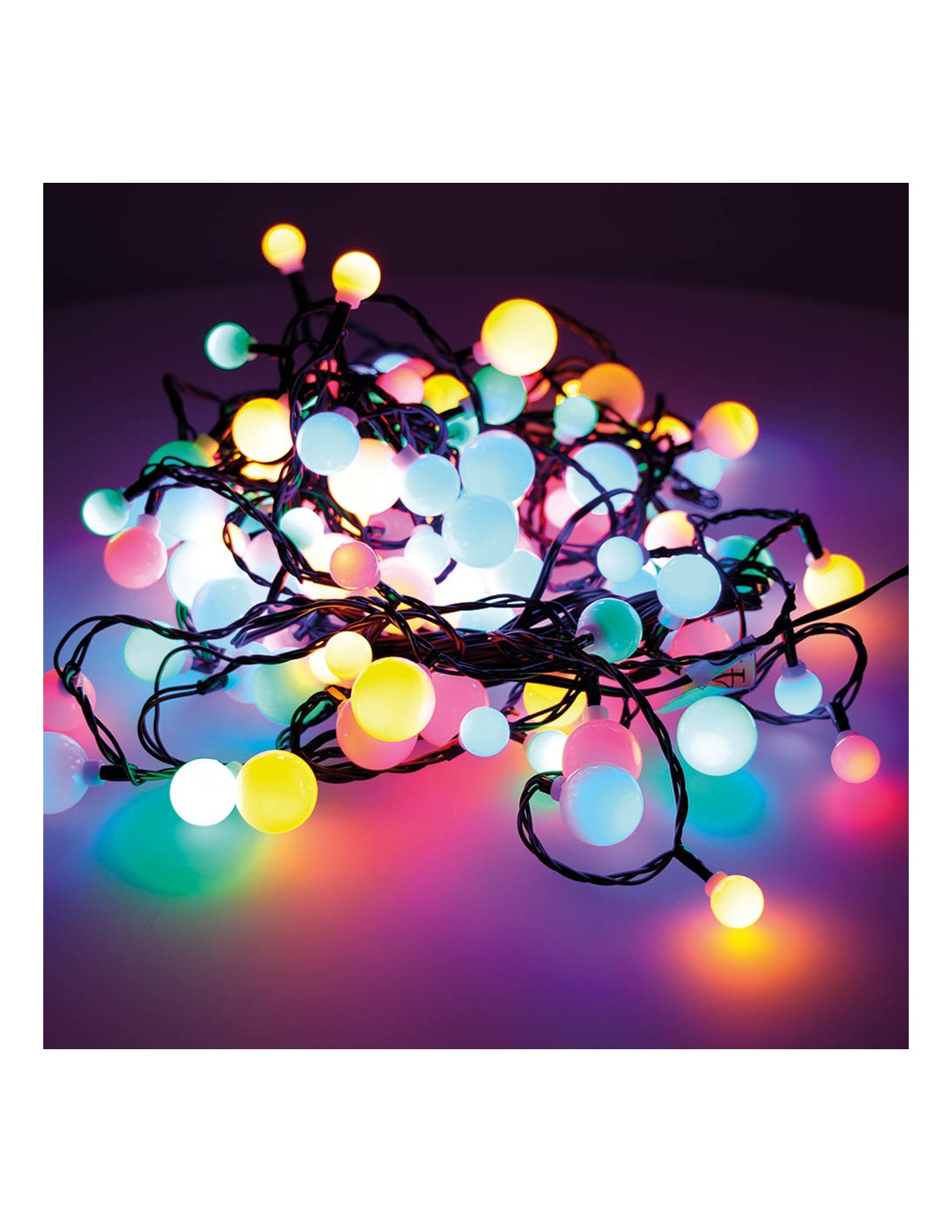 Guirnalda "cherry" 120 leds de tres medidas (ø14 / 19 / 24 mm), multicolor, 220 - 240 v 50/60 hz, ip44 exterior, cable negro, cable alimentación de 5 m, distancia entre la primera bombilla y la ultima: 9 m. distancia entre bombillas: 7,5 cm, bombillas no reemplazables, largo total: 14 m, temporizador: 8 h encendido / 16 h apagado