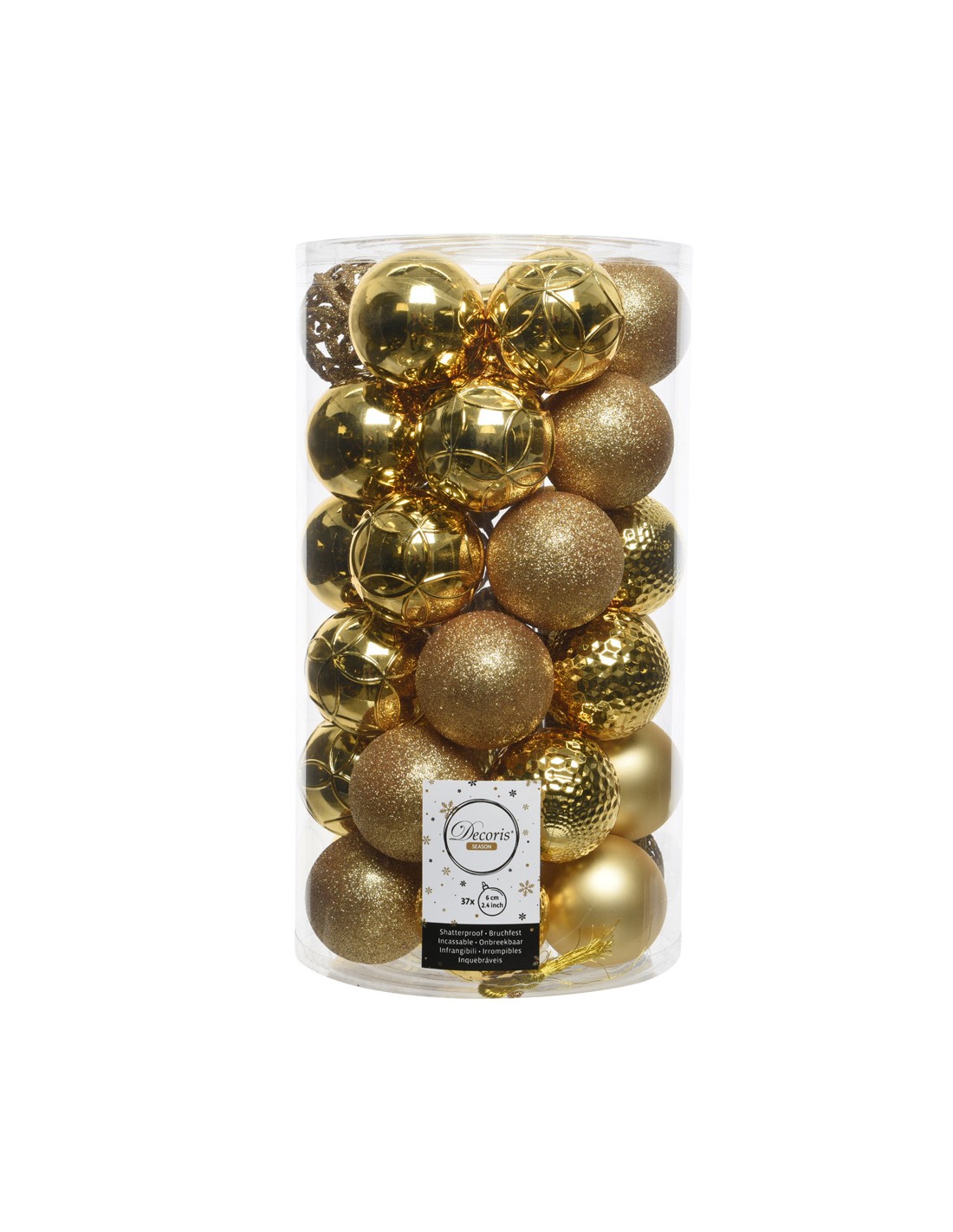 Tubo con 37 bolas doradas decorativas para arbol de navidad mezcla de diferentes modelos y texturas en color dorado dia. ø6cm (diámetro)