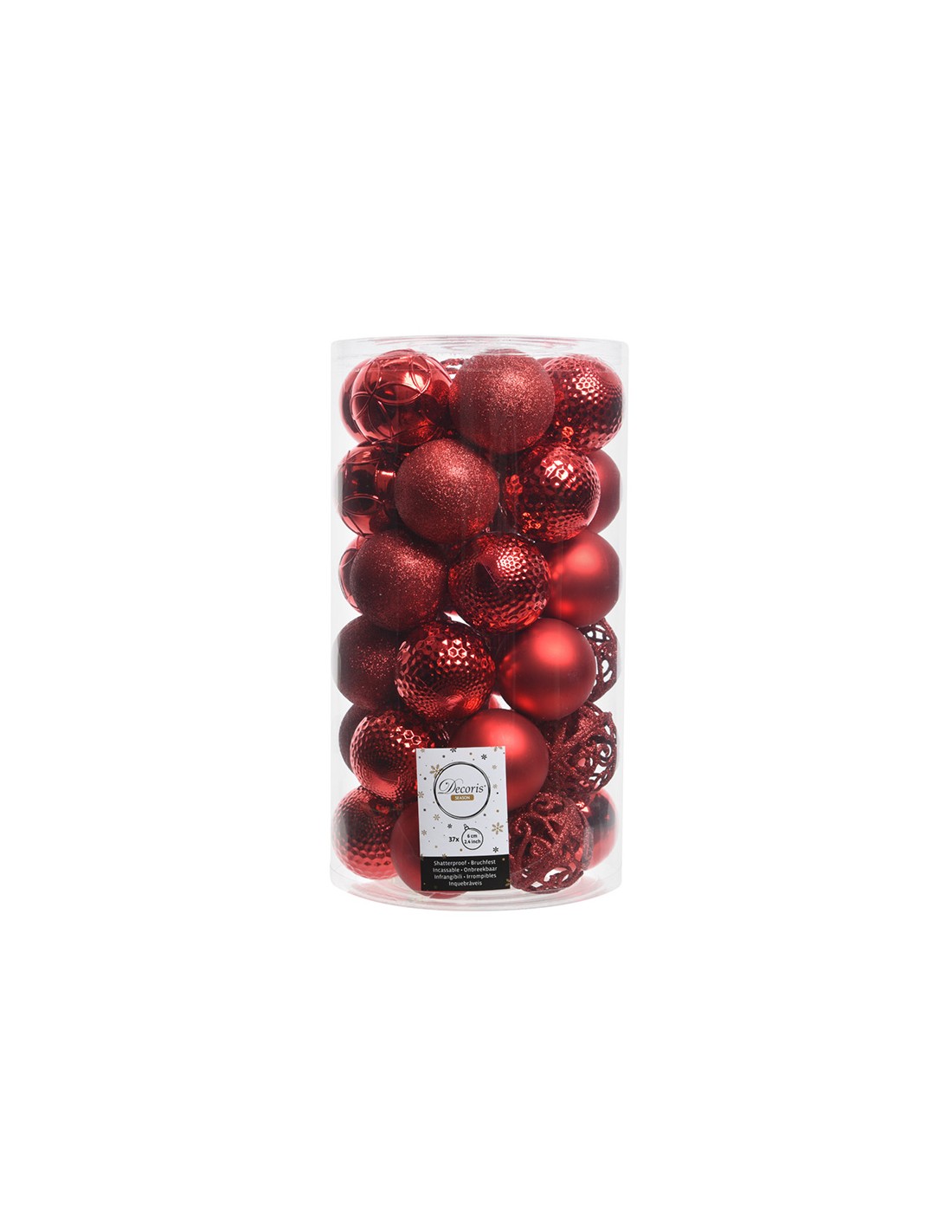 Tubo con 37 bolas rojas decorativas para arbol de navidad mezcla de diferentes modelos y texturas en color rojo ø6cm