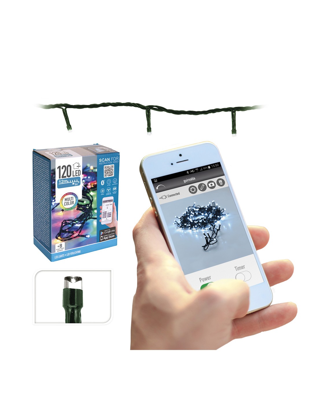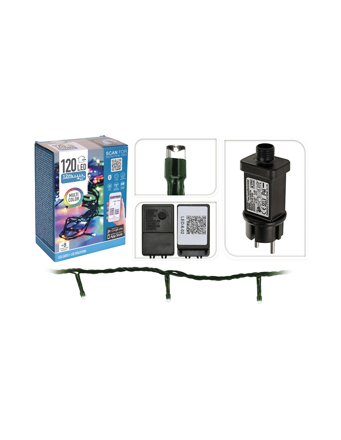 Guirnalda 120 leds multicolor funcion app pitelo vintage 220-240v ip44 led 5mm cable verde 5m distancia entre leds 10cm medidas transformador cable alimentación 5m. distancia entre la primera bombilla y la ultima 12m. largo total: 17m.