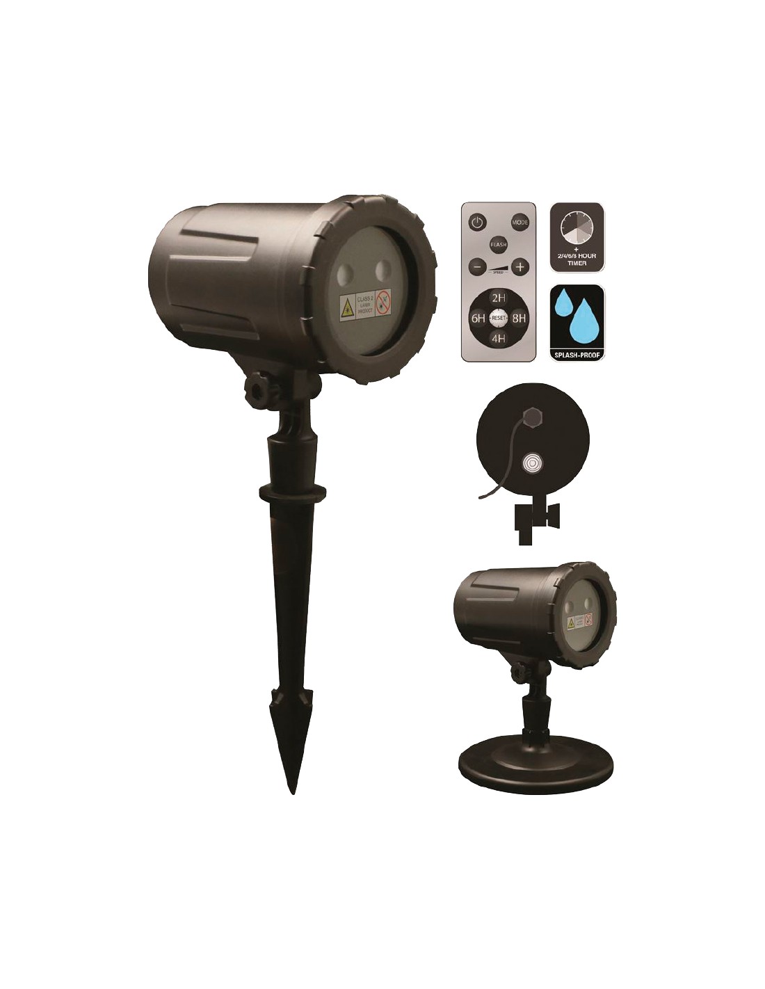 Proyector laser 2 colores efectos varios laser de clase 2 ip44 con base inlcuida 5m de cable 220-240v con mando a distancia incluido (funciona con pila cr2025 inlcuida) 3 tipos de velocidad con temporizador con efecto flash diferentes combinaciones de color 11x15,5x18cm (ancho/fondo/alto)