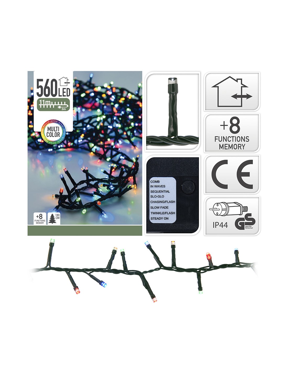 Guirnalda led "tipo espino" 560 leds multifuncion led extra multicolor. bombillas de 5mm. cable verde. distancia entre bombillas de 2cm. adaptador ip44. incluye programador con memoria y 8 funciones. ce 3v/2ma cable alimentación 3m. distancia entre la primera bombilla y la ultima 11m. largo total: 14m