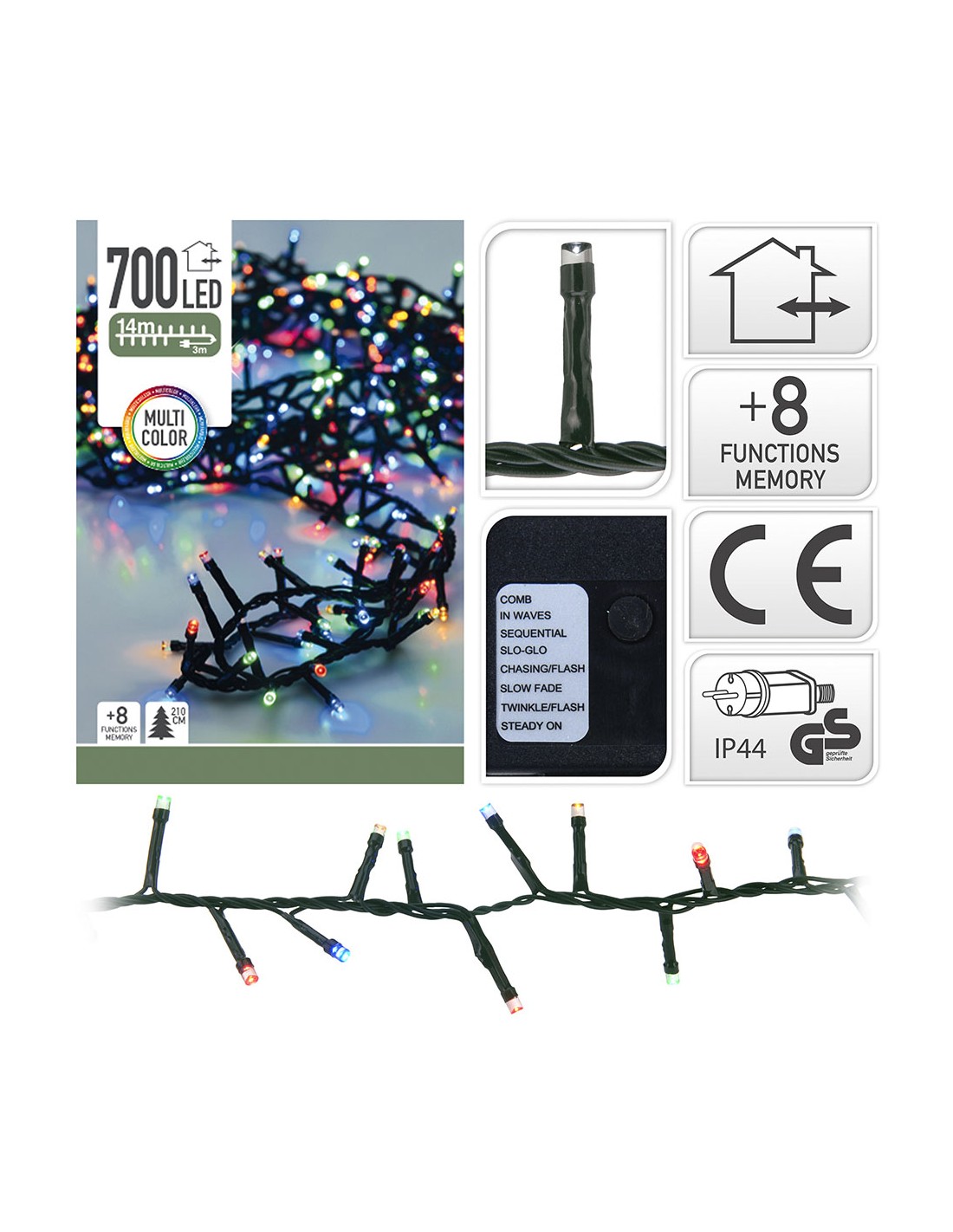 Guirnalda led "tipo espino" 700 leds multifuncion led extra multicolor bombillas 5mm cable verde largo distancia entre bombillas de 2cm. ip44. programador 8 funciones con memoria. ce. 3v/2ma cable alimentacion 3m. distancia entre la primera bombilla y la ultima 14m. largo total: 17m