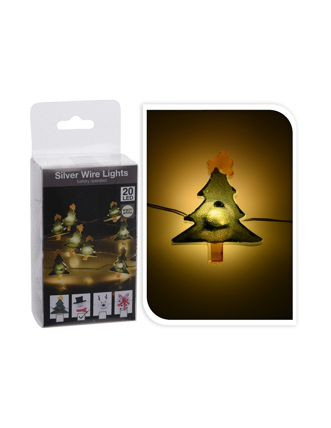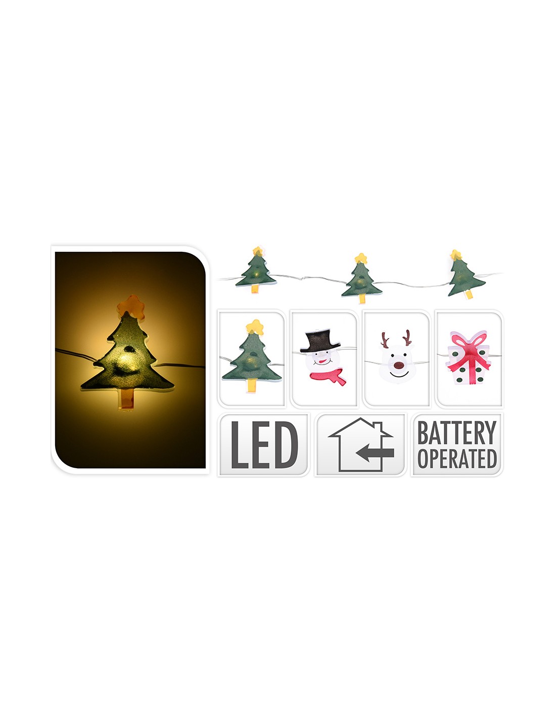 Guirnalda a pilas fija 20 leds decorativos motivos navideños (regalos, muñecos de nieve, arboles y renos) pilas 2xaa ip20 cable transparente 5cm entre bombillas led cable alimentación 10cm. distancia entre la primera bombilla y la ultima 0,95m. largo total: 1,05m colores/modelos surtidos