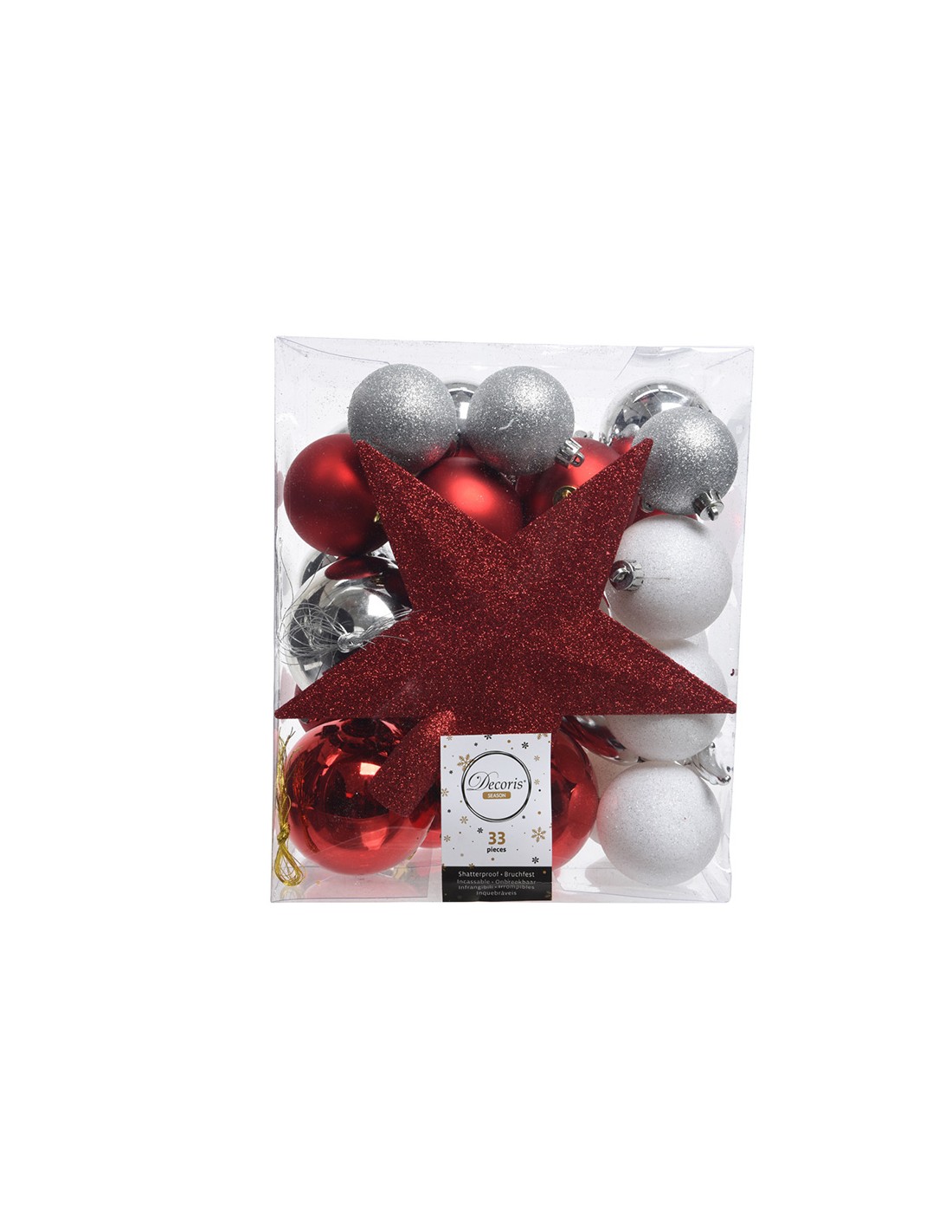 Caja de 33 accesorios para arbol plata, rojo y blanco mat. incluye 1: estrella roja, 2 bolas color rojas y 2 plata de 8cm. 6 bolas plata y 6 rojas de 6cm. 3 bolas blancas y 3 rojas de 6cm.4 bolas rojas, 3 bolas gris y 3 figuras de estalactitas. incluye hilo para colgar.