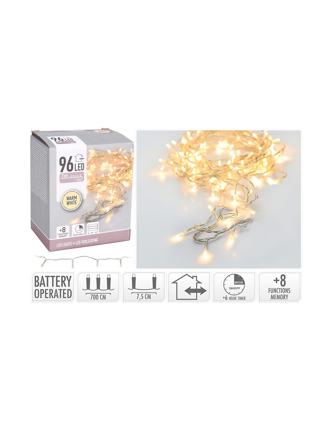 Guirnalda a pilas multifuncion 96 leds cable transparente luz blanco calido pilas 3xaa no incluidas ip44 7,5cm entre bombillas leds 5mm programador 8 funciones con memoria + temporizador 6h encendido 18h apagado cable alimentación 50cm. distancia entre la primera bombilla y la ultima 7m. largo total: 7,50m.