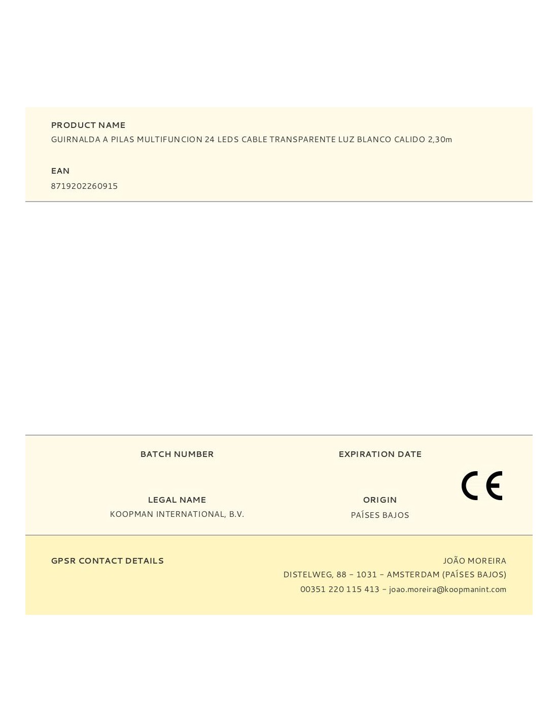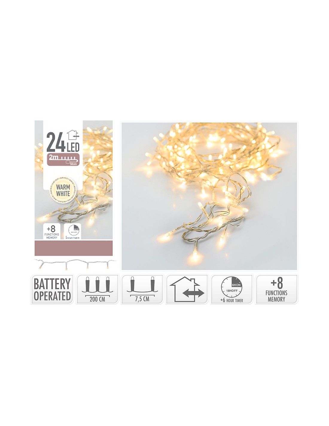 Guirnalda a pilas multifuncion 24 leds cable transparente luz blanco calido pilas 3xaa no incluidas ip44 7,5cm entre bombillas leds 5mm programador 8 funciones con memoria + temporizador 6h encendido 18h apagado cable alimentación 50cm. distancia entre la primera bombilla y la ultima 1,80m. largo total: 2,30m