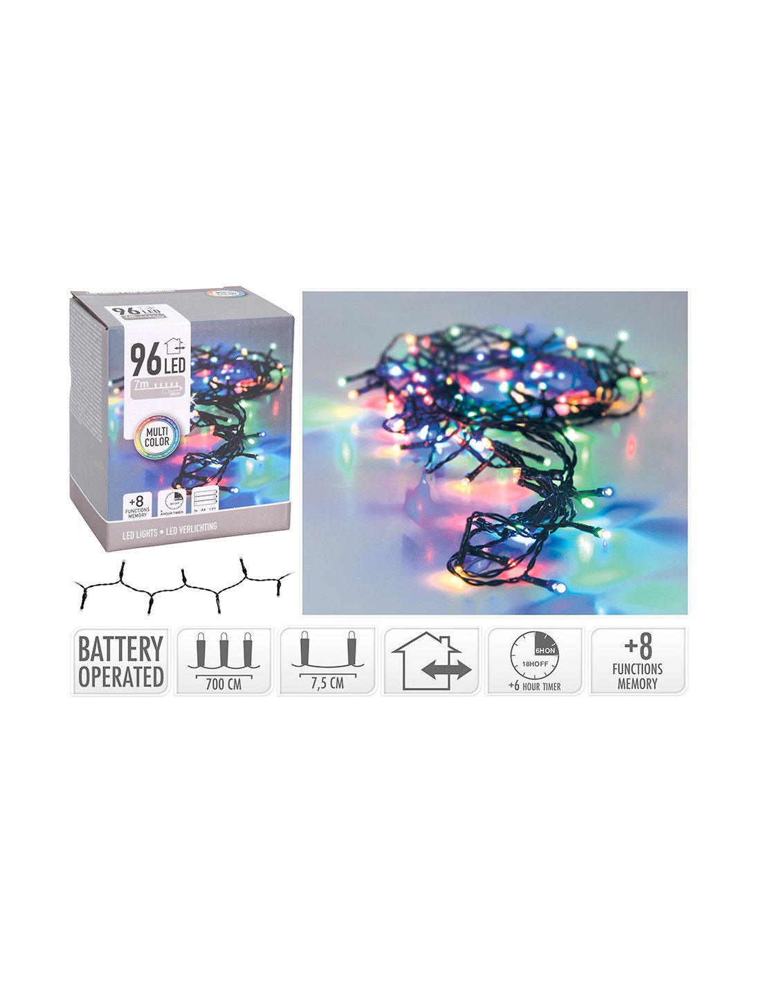 Guirnalda a pilas multifuncion 96 leds cable negro luz multicolor pilas 3xaa no incluidas ip44 7,5cm entre bombillas leds 5m programador 8 funciones con memoria + temporizador 6h encendido 18h apagado cable alimentación 50cm. distancia entre la primera bombilla y la ultima 7m. largo total: 7,50m.